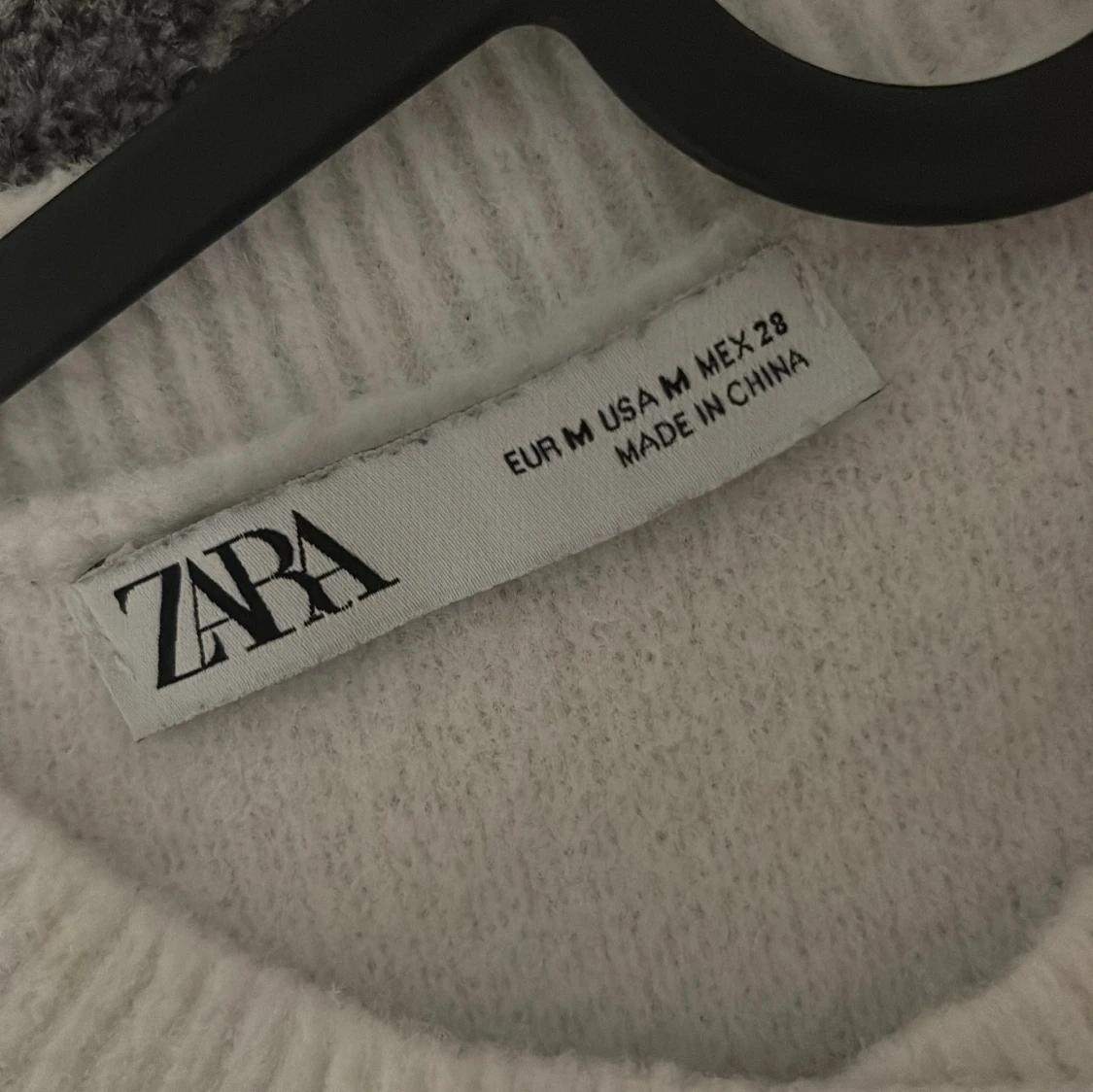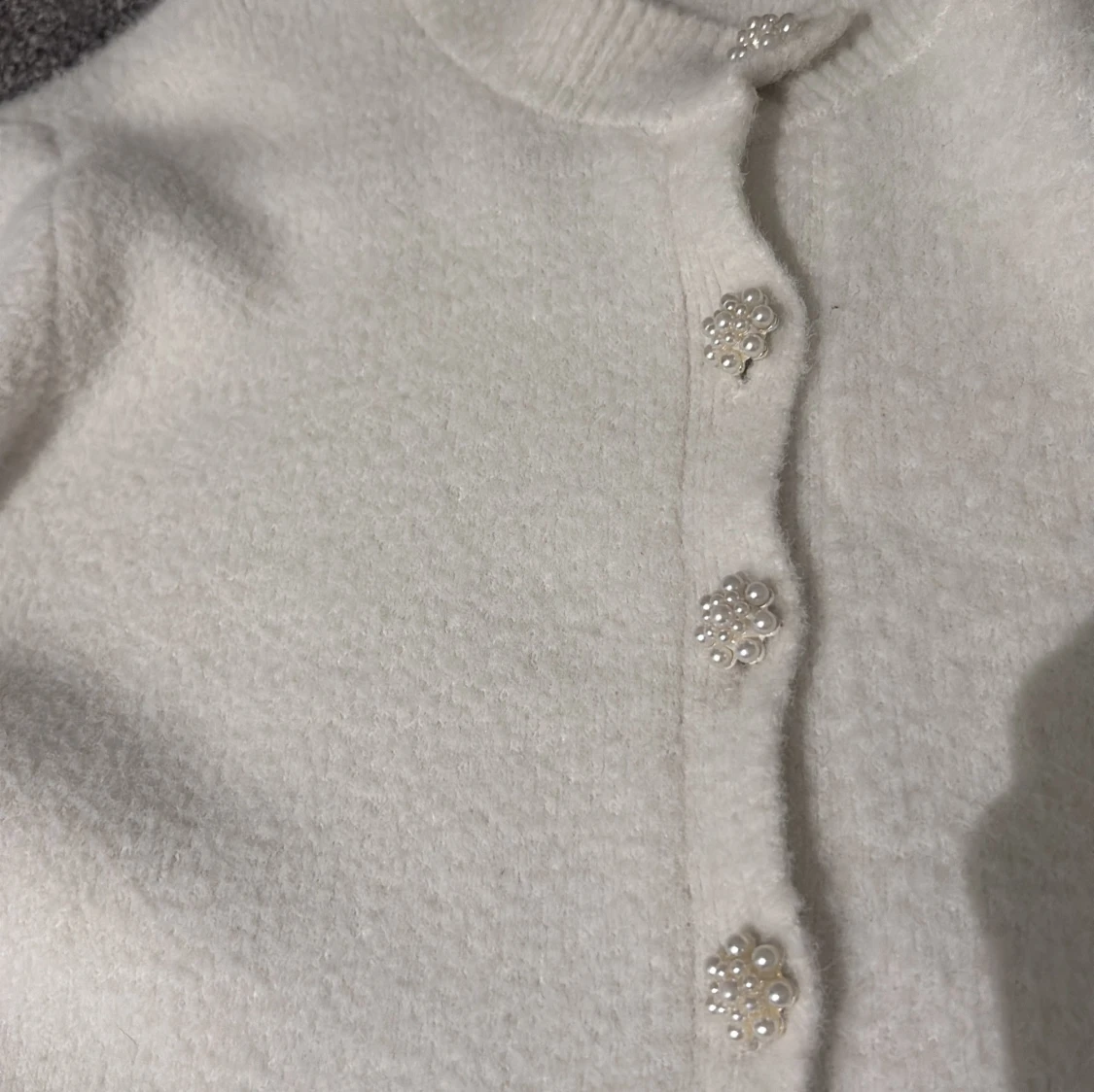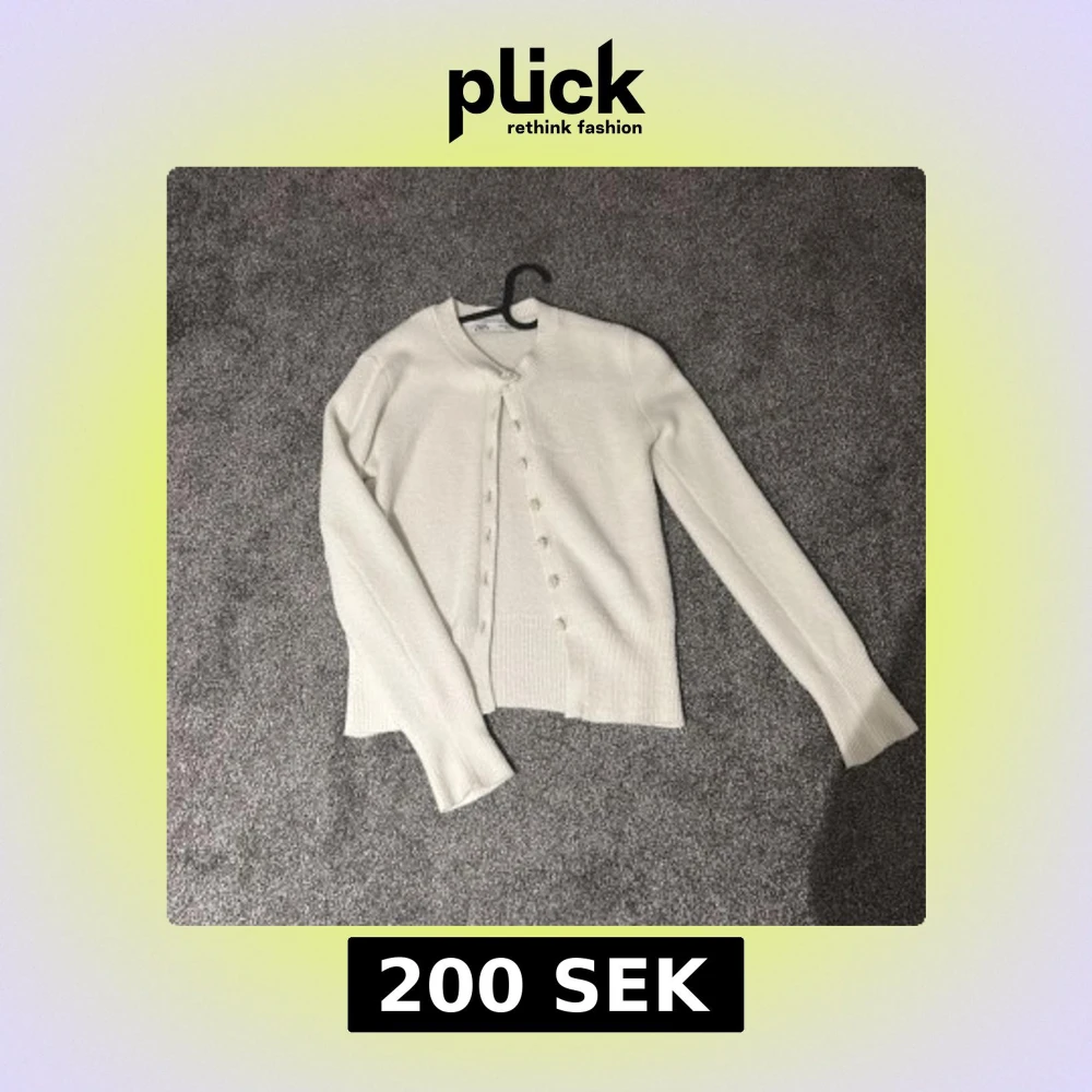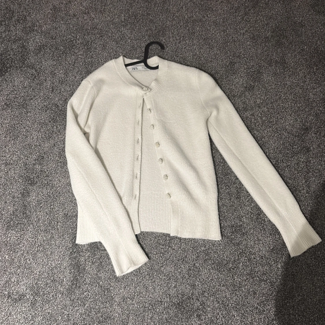 Superfin vit kofta från Zara i mjukt stickat material. Koftan har långa ärmar, ribbade muddar och snygga pärlknappar som ger en lyxig touch. Perfekt att slänga över en topp för en clean och stilren look. Ny pris 399 kr