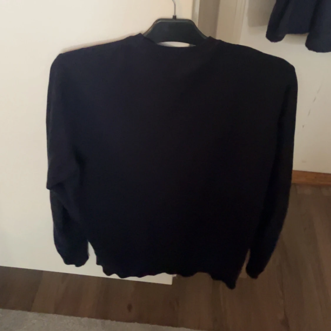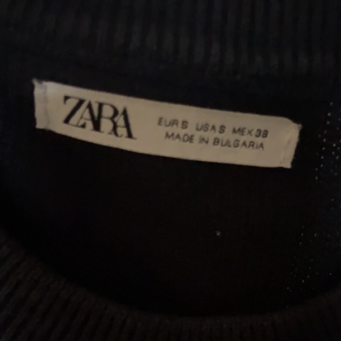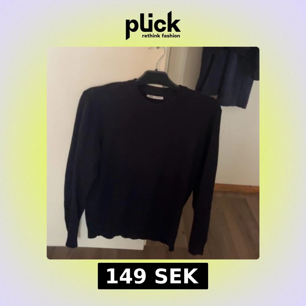 En stilren svart stickad tröja från Zara i storlek S. Tröjan har rund halsringning och långa ärmar, perfekt för dig som gillar enkel och clean look. Materialet är mjukt och skönt, passar till många olika outfits. Snygg att bära både till jeans och kjol.