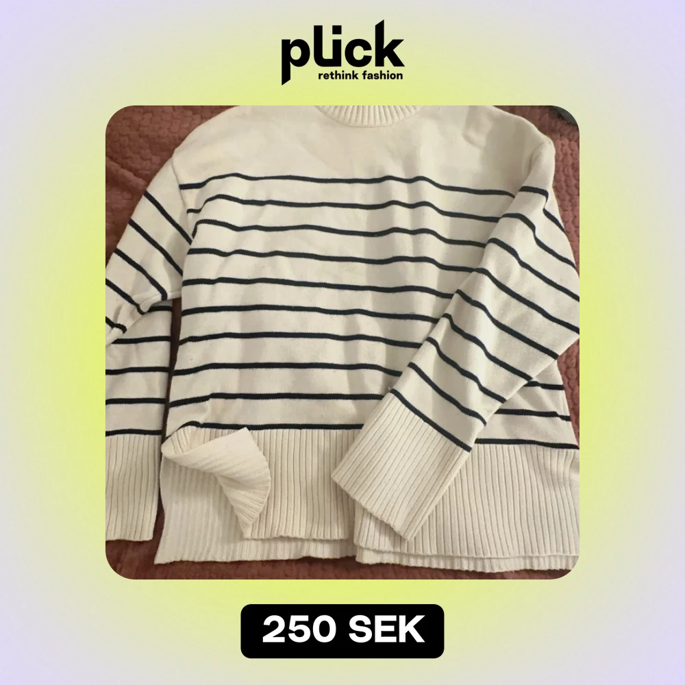 Säljer en stilren vit tröja med svarta ränder från Zara. Tröjan har långa ärmar och en ribbad krage samt nederkant. Perfekt för en avslappnad look.