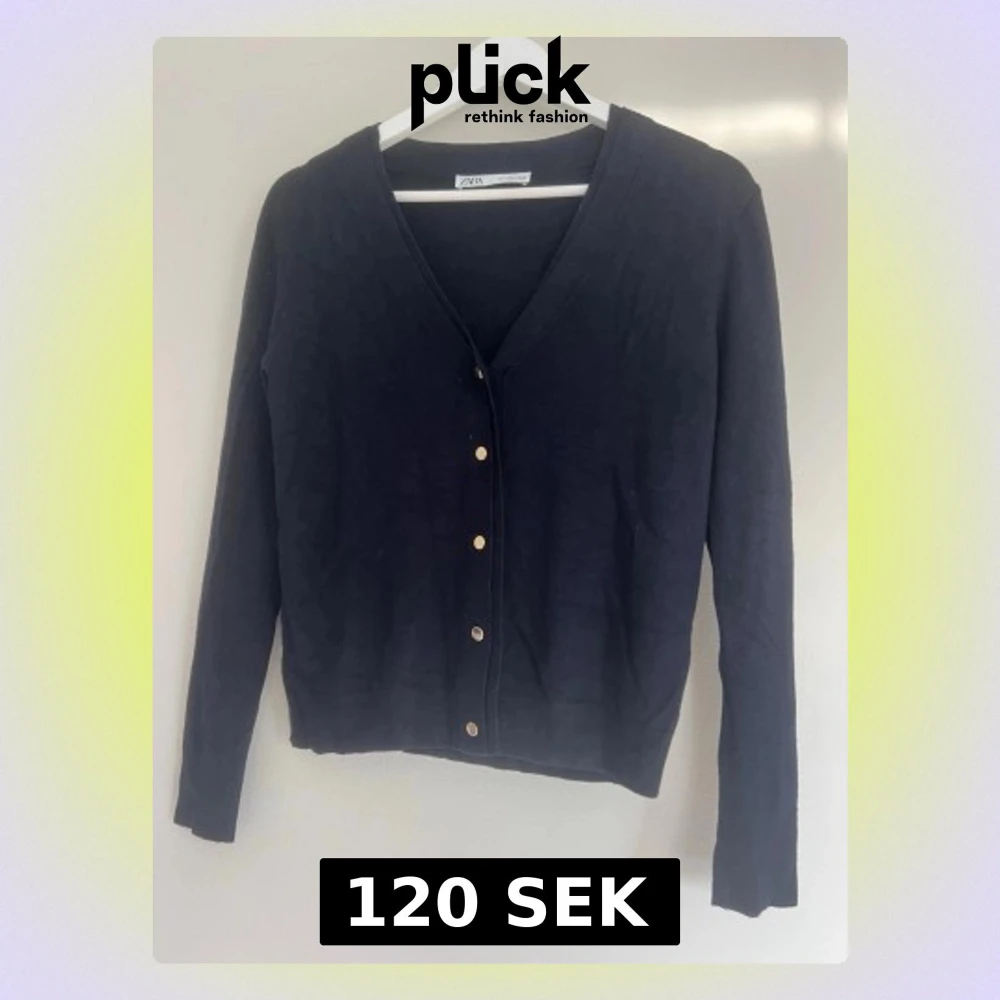 Säljer denna mörkblåa cardigan från Zara i storlek S med v-ringning och guldfärgade knappar framtill.