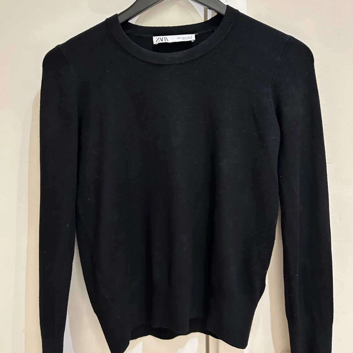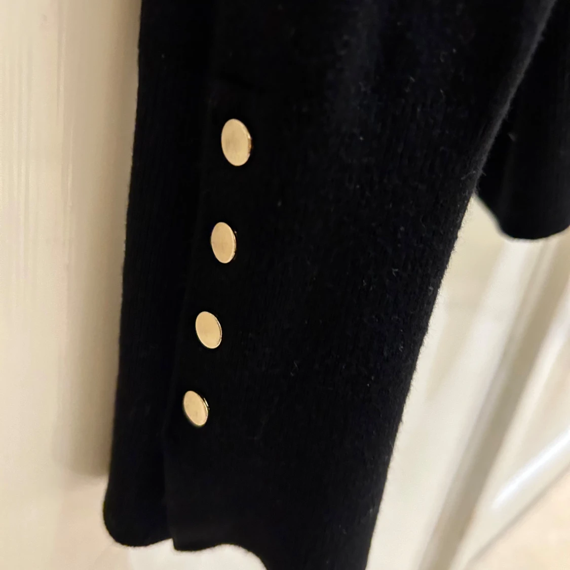Svart stickad tröja från Zara i storlek S. Tröjan har rund halsringning, långa ärmar och snygga guldknappar vid ärmsluten som ger en extra touch. Perfekt för dig som gillar stilrena och enkla plagg med en twist.