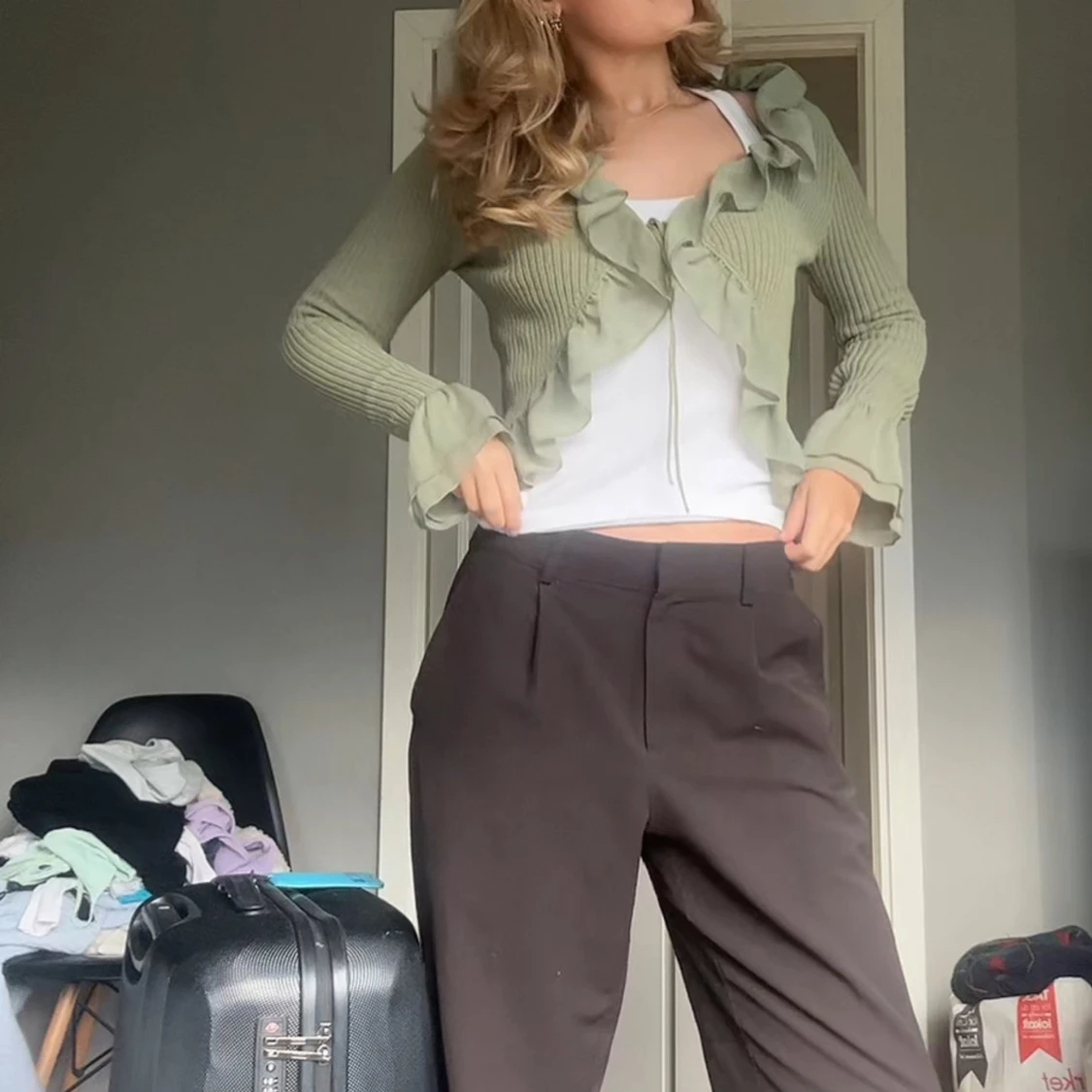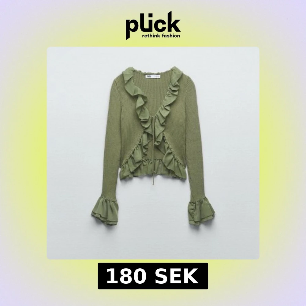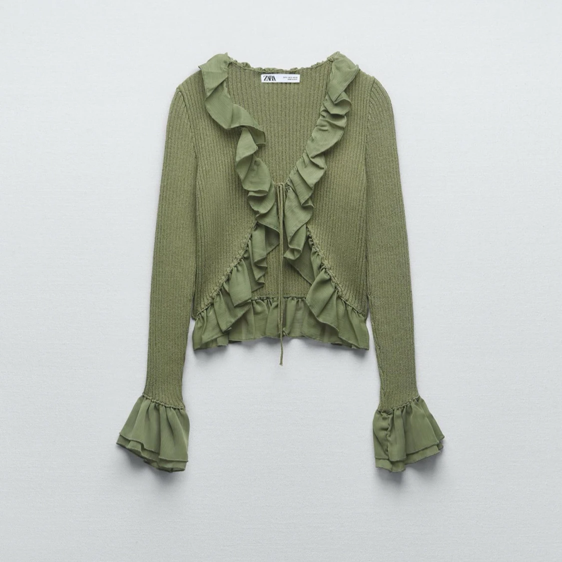 Säljer en ljusgrön kofta från Zara med snygga volangdetaljer längs halsringningen, framkanten och ärmsluten. Koftan är ribbstickad, har lång ärm och knyt framtill. Perfekt att styla över ett linne eller t-shirt för en trendig look.