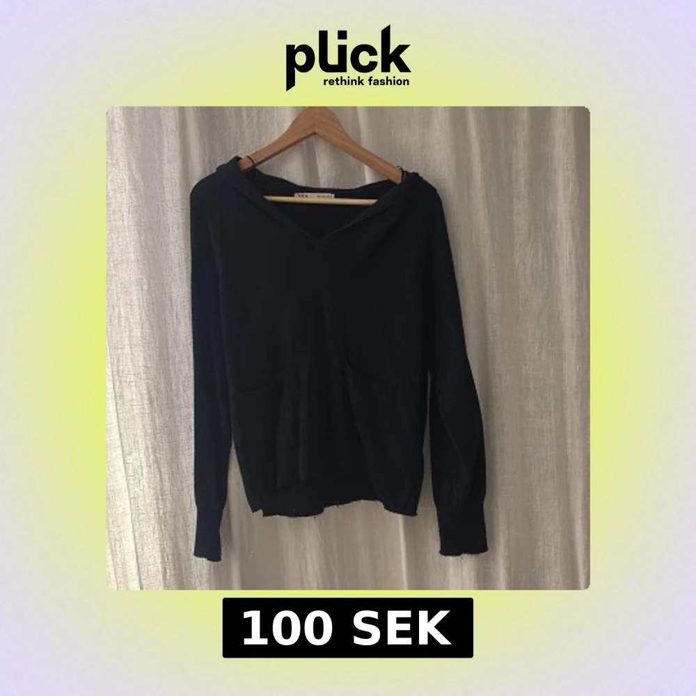 Mörkblå stickad hoodie från ZARA med två fickor framtill och en bred krage som går över axlarna. Tröjan har långärmade ärmar och en avslappnad passform. Perfekt för dig som gillar enkel och stilren design.