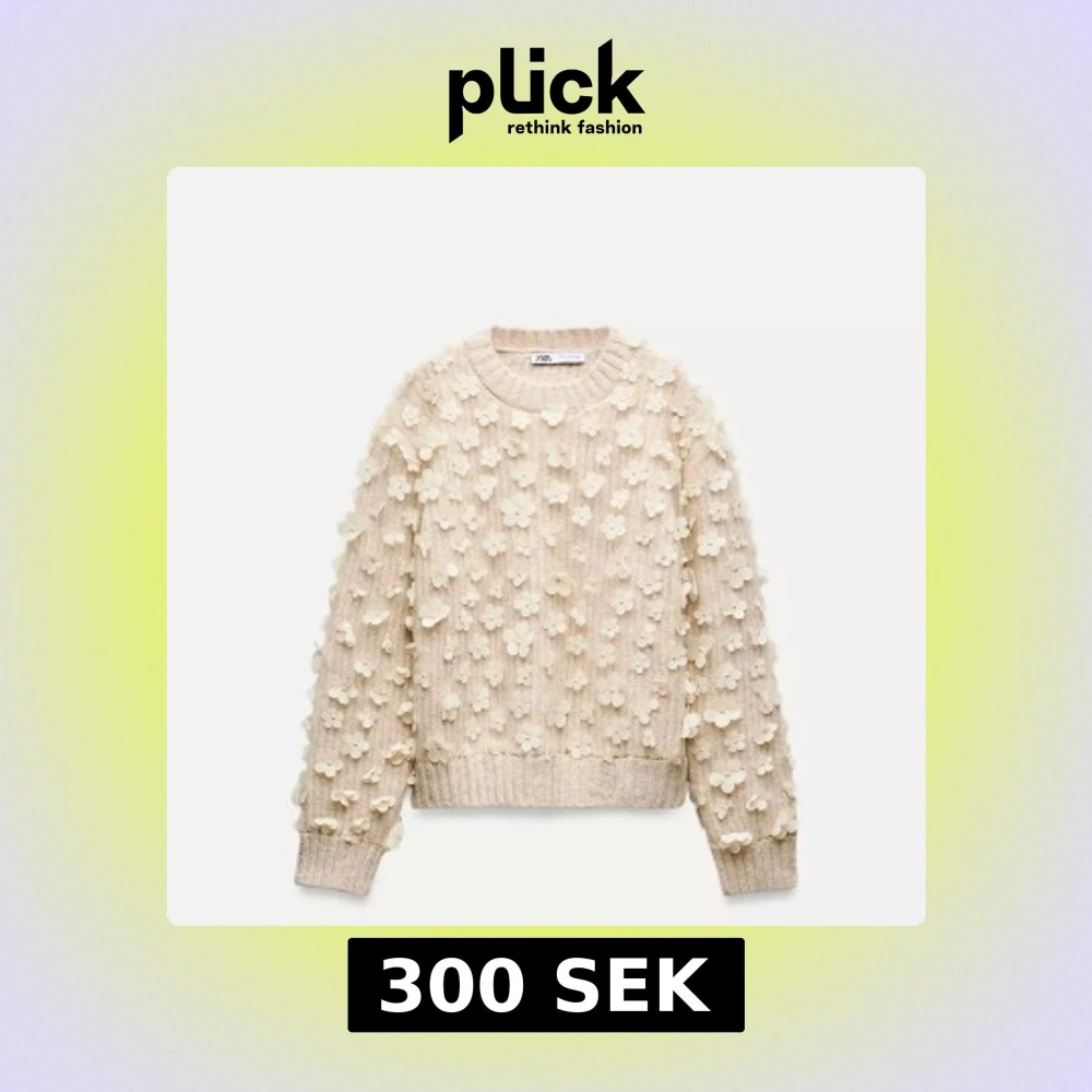 Säljer en unik beige tröja från Zara med 3D-blommor över hela ytan. Tröjan har långa ärmar och ribbade muddar vid ärmslut och nederkant. Perfekt för att ge din outfit en extra touch! 🌸