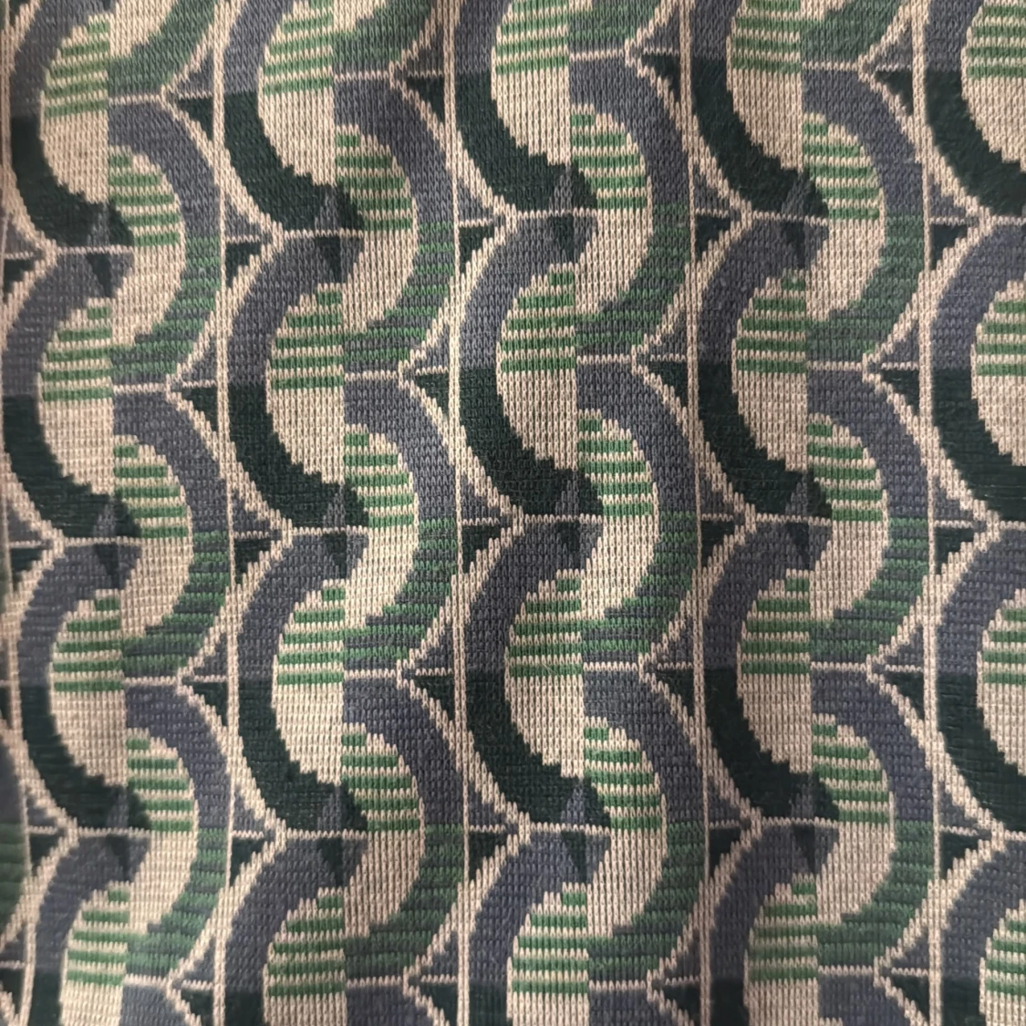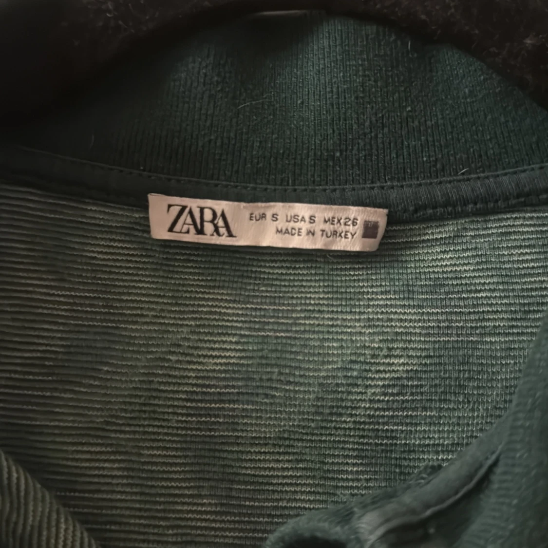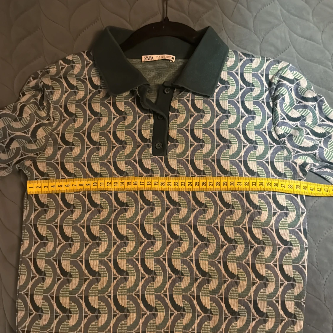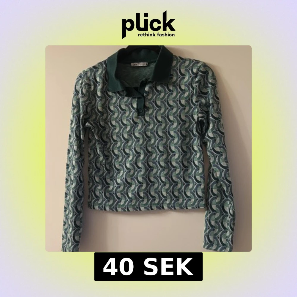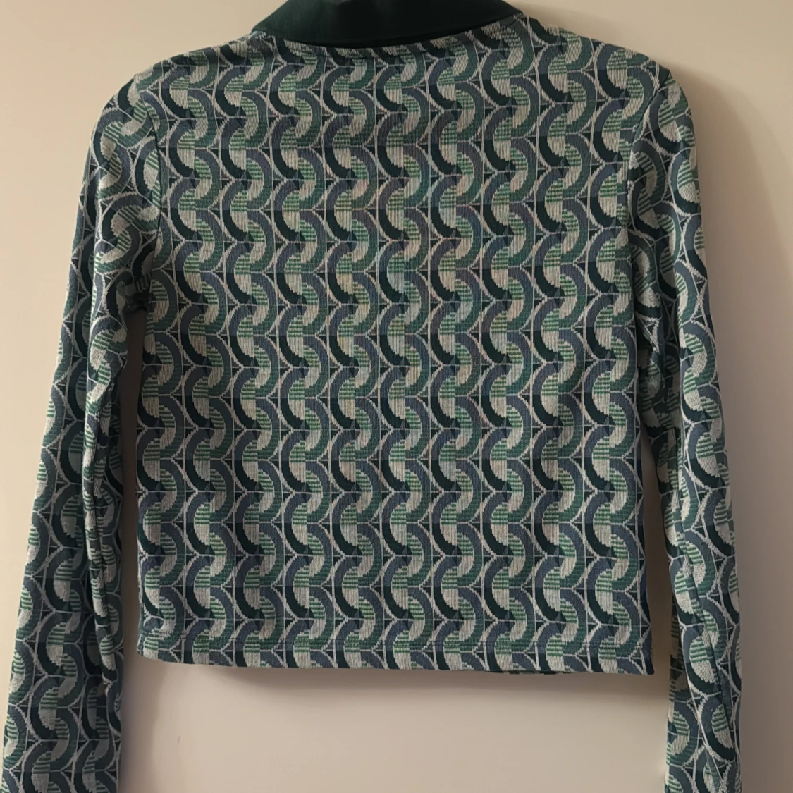 Snygg pikétröja från Zara i storlek S med retroinspirerat geometriskt mönster i grönt, blått och beige. Tröjan har klassisk krage, knappar framtill och långa ärmar. Perfekt för dig som gillar unika prints och vill sticka ut lite extra.