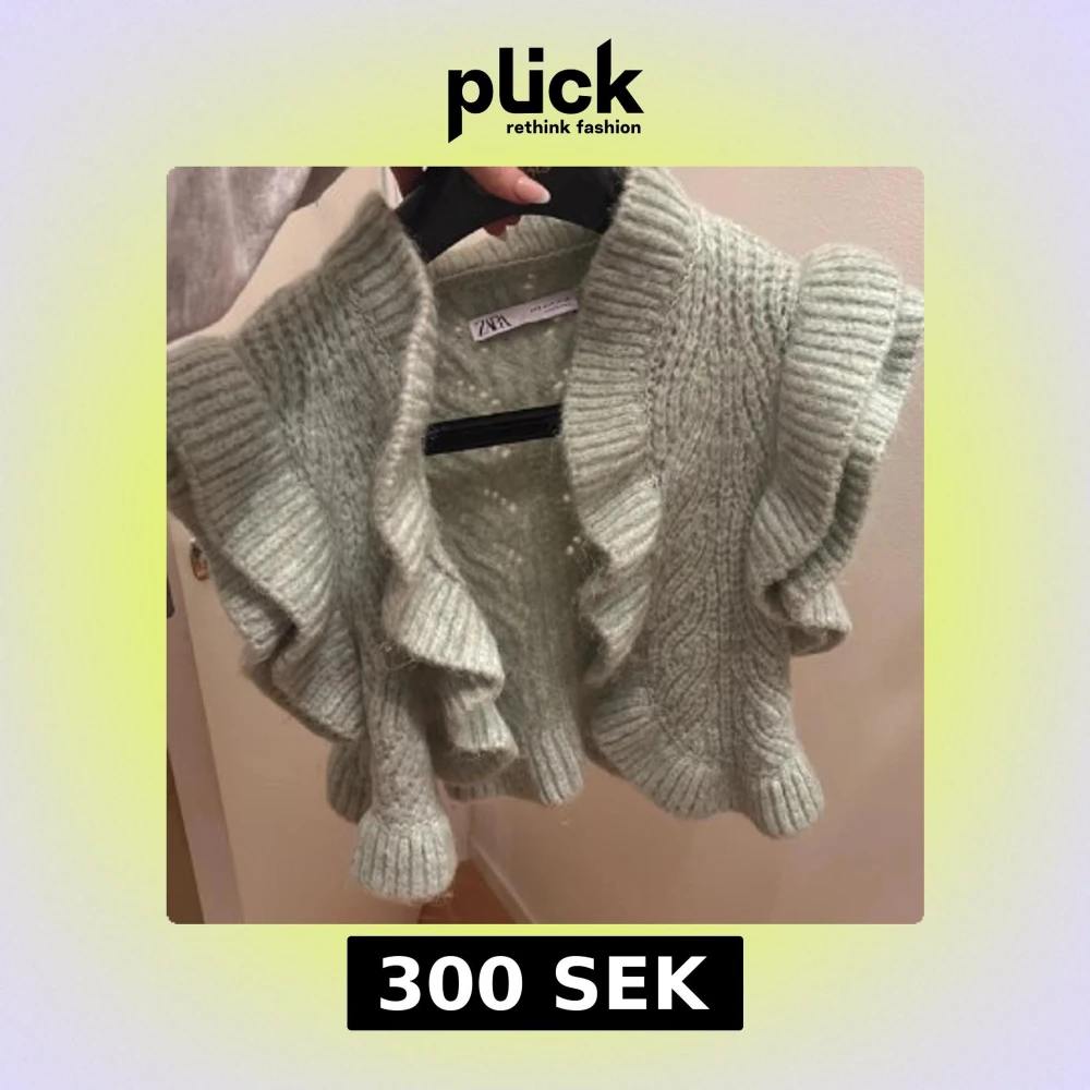Säljer en mysig grön stickad kofta från Zara med volangdetaljer. Koftan har en unik design med korta ärmar och ribbade kanter. Perfekt för att hålla sig varm och stilren under kyligare dagar.