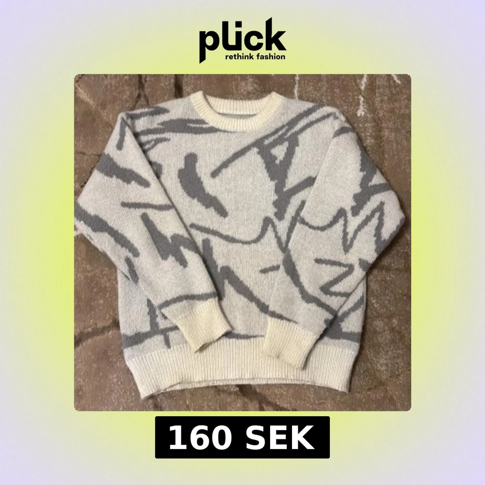 Säljer en gråvit stickad tröja med abstrakt mönster i grått. Tröjan har rund hals, ribbade muddar och långärmad passform. Perfekt för dig som gillar en chill och stilren look med lite edge.