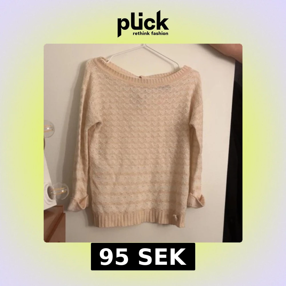 Mysig beige stickad tröja med diskret strukturmönster och bred ribbad kant vid hals, ärmslut och nederkant. Långärmad och perfekt för lager-på-lager under kyligare dagar. Enkel att matcha med jeans eller kjol för en avslappnad look.