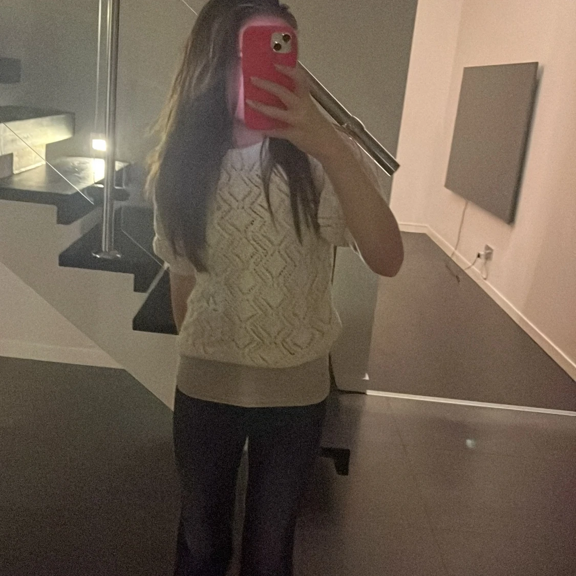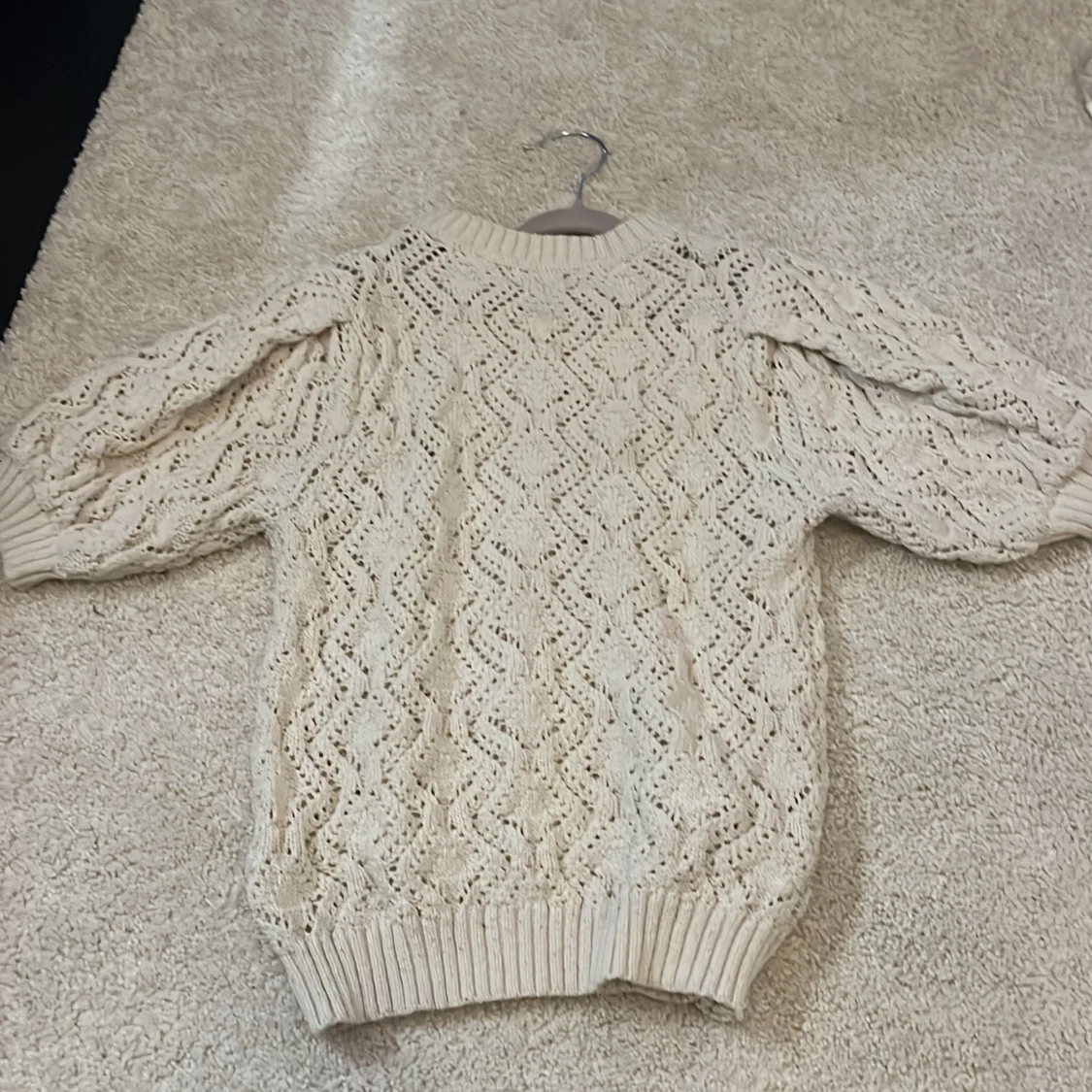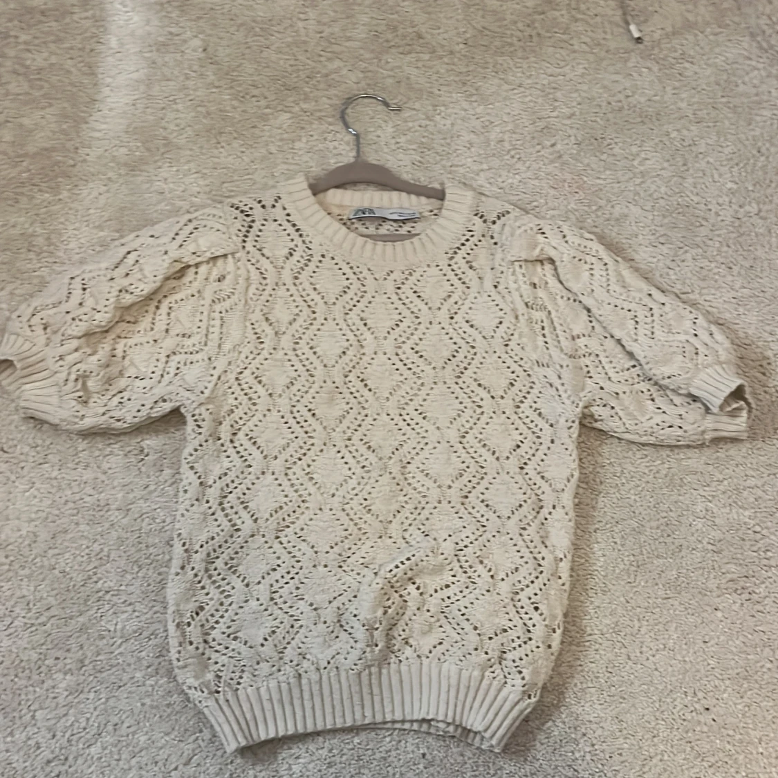 Supersöt vit stickad tröja från Zara med korta puffärmar och snyggt hålmönster. Tröjan har rund hals och ribbade muddar vid ärmslut och nederkant. Perfekt för dig som gillar en chill och trendig look med lite extra detaljer.