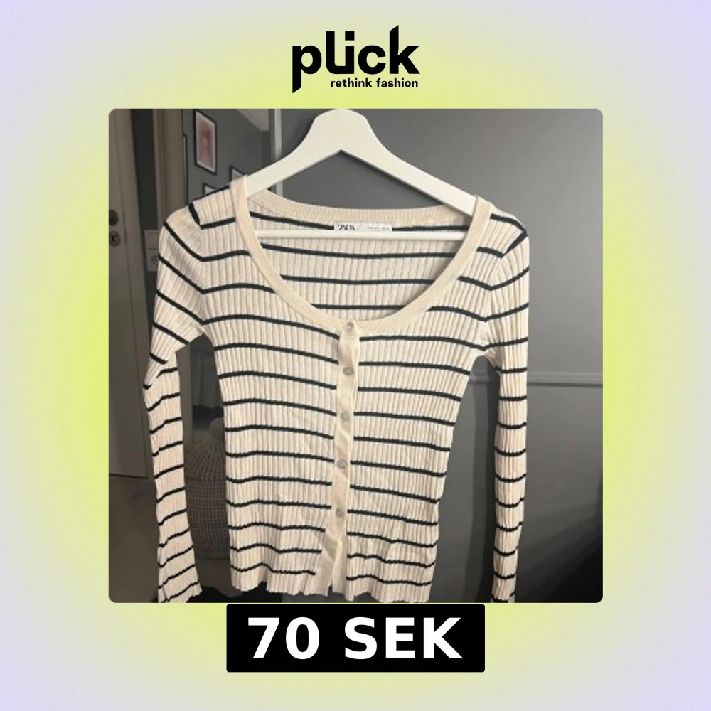 Säljer en smalrandig, ribbad kofta från Zara i beige och svart. Tröjan har långa ärmar, knappar framtill och en croppad passform. Perfekt att styla över ett linne eller t-shirt.