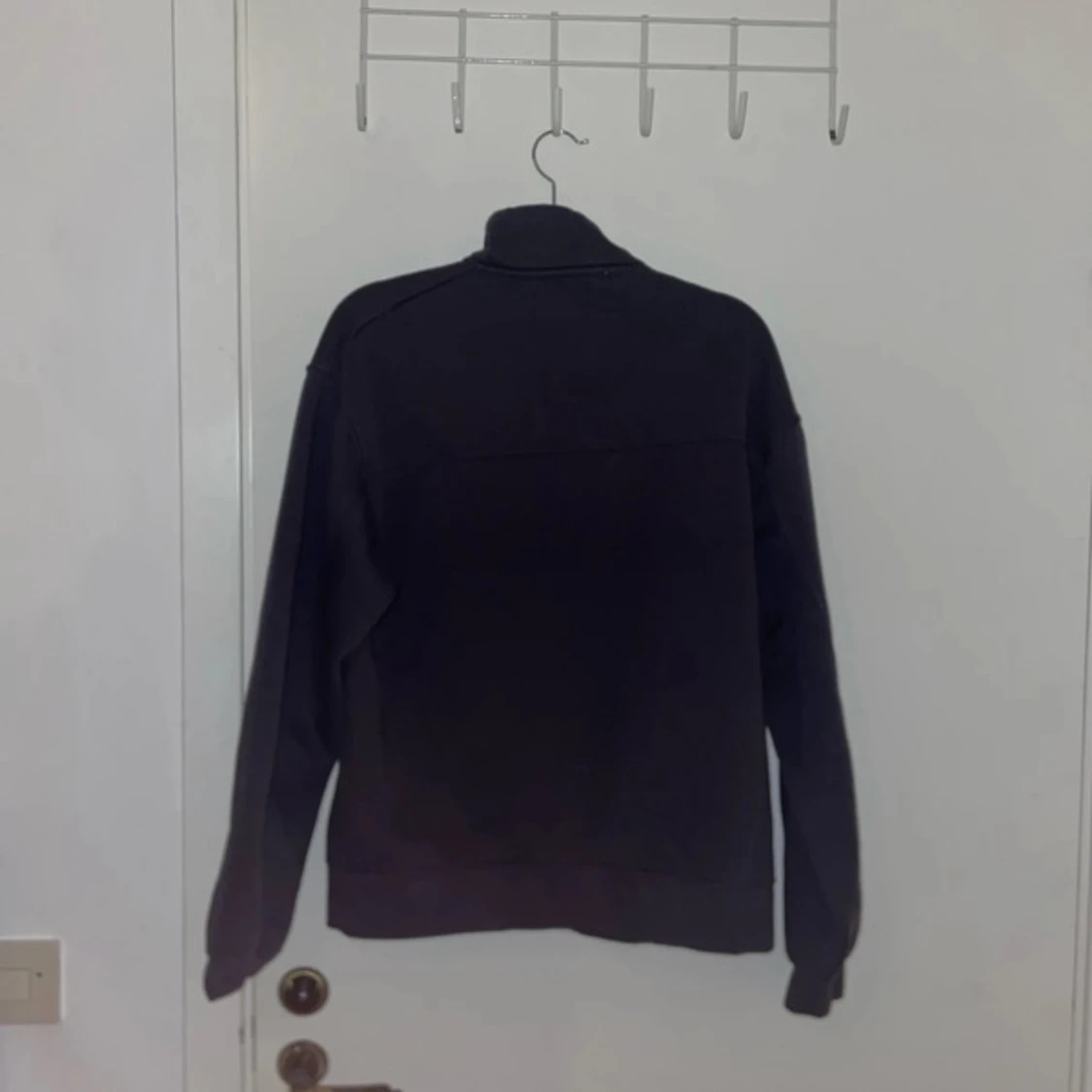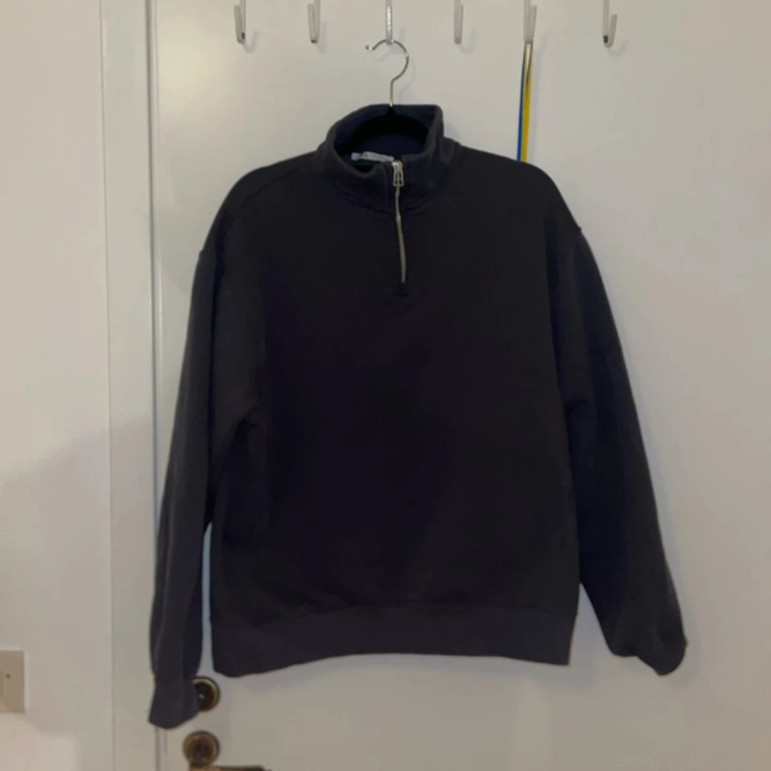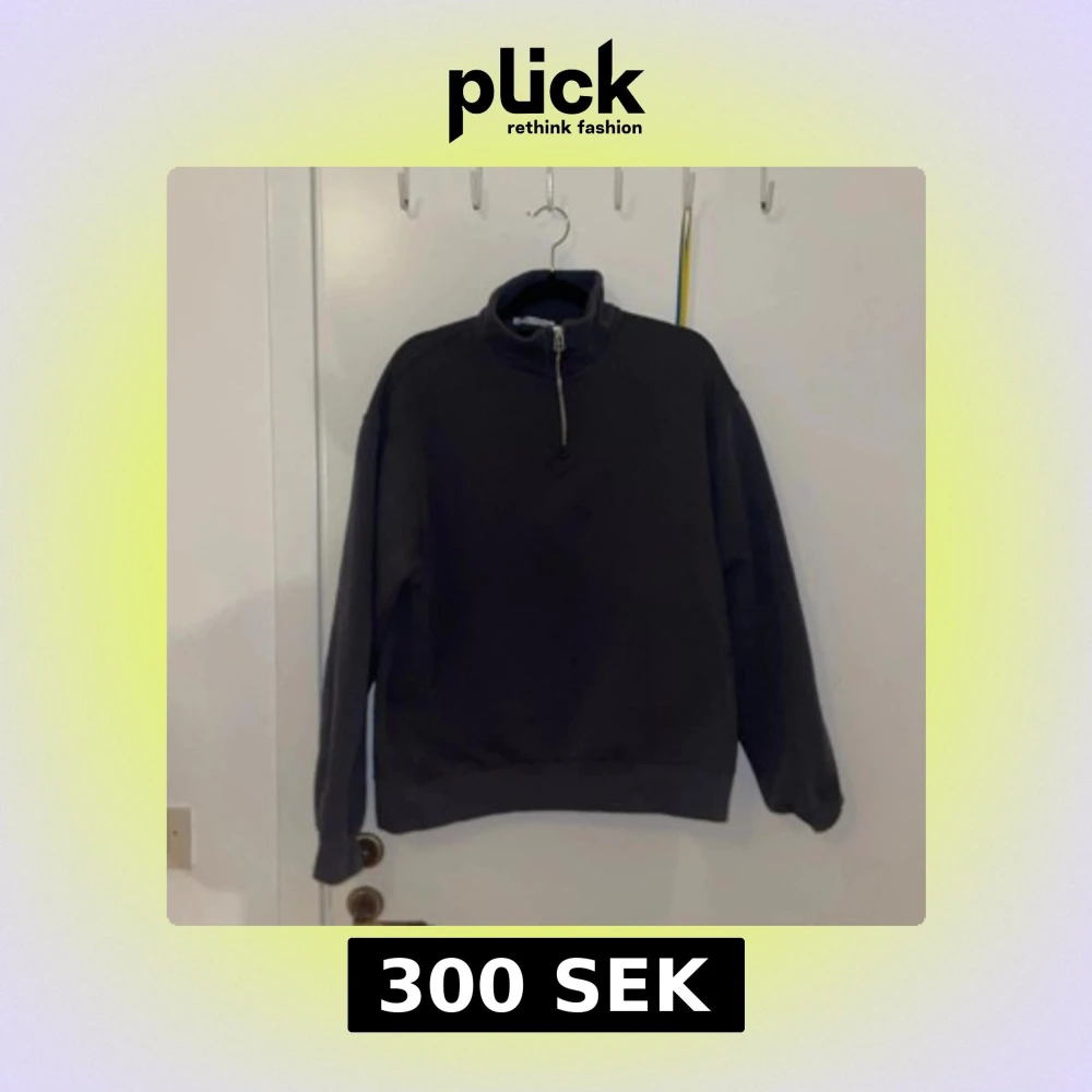 Säljer en stilren mörkgrå tröja med halv dragkedja och hög krage. Perfekt för kyligare dagar. Tröjan har långa ärmar och en avslappnad passform.