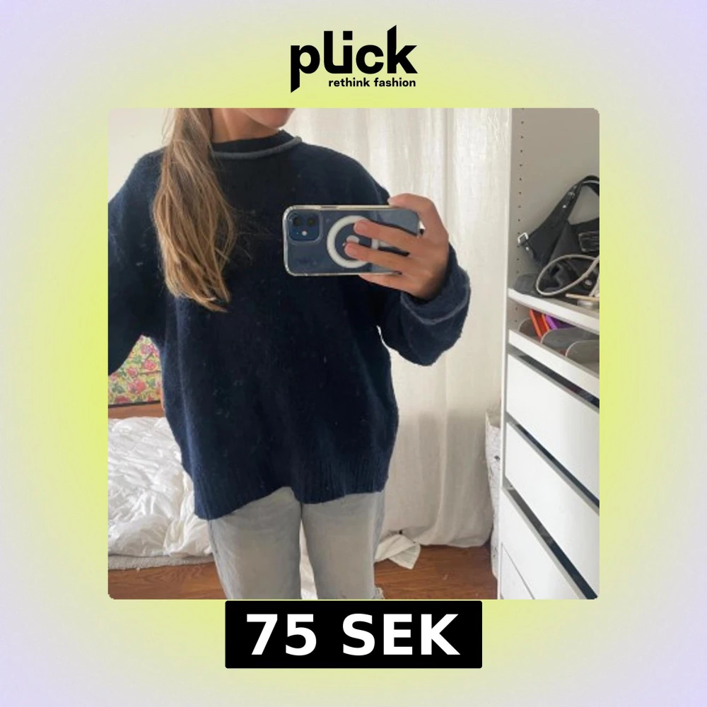 Mysig mörkblå stickad tröja från Zara med ljusblå detaljer vid halsringning och ärmslut. Tröjan har en loose passform, rund hals och långa ärmar. Perfekt för dig som gillar chill och enkel stil med en touch av färg. Och en öppen rygg.