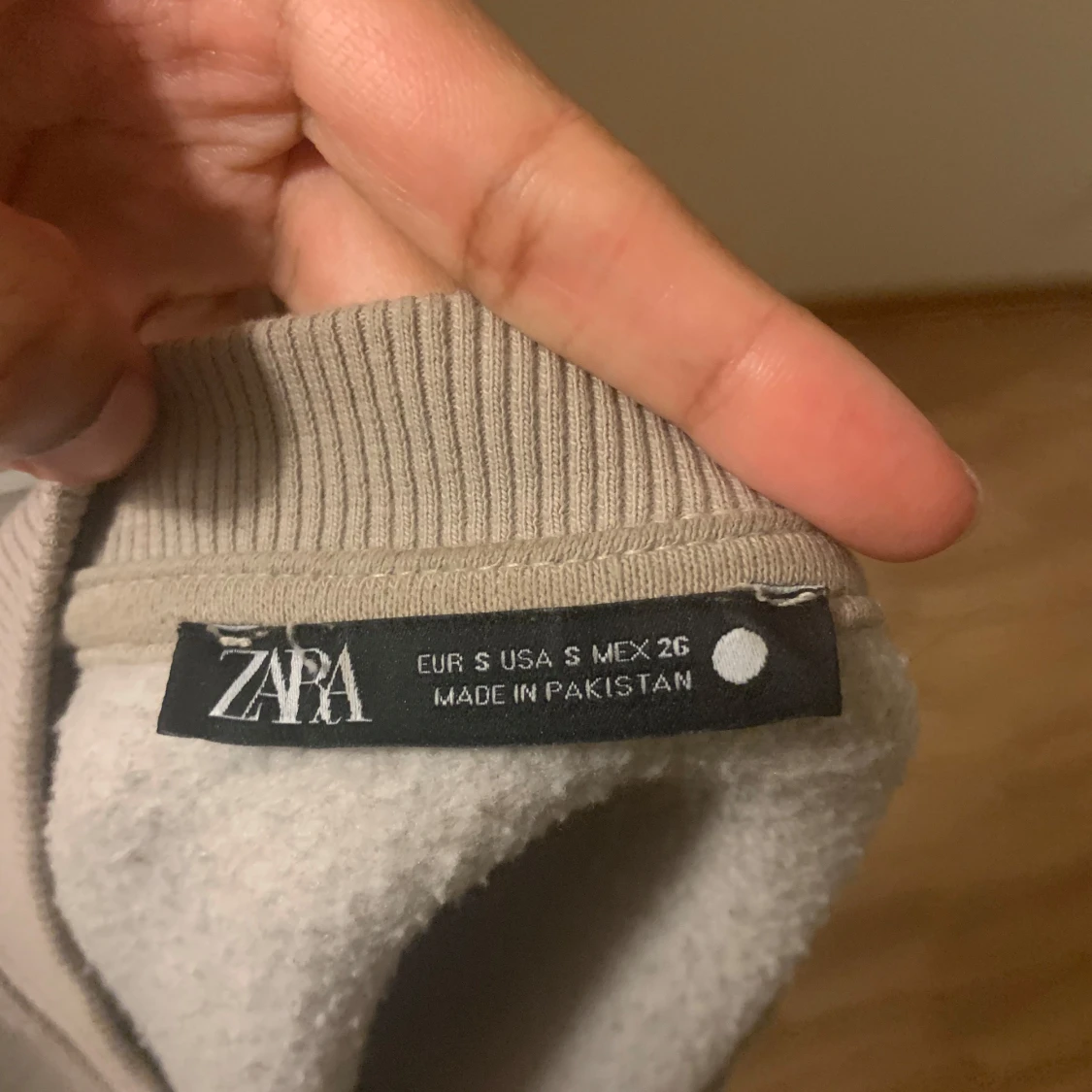 Säljer en beige tröja från Zara. Den har en enkel design med långa ärmar och ribbade muddar vid ärmslut och nederkant. Perfekt för en avslappnad look. 🧥