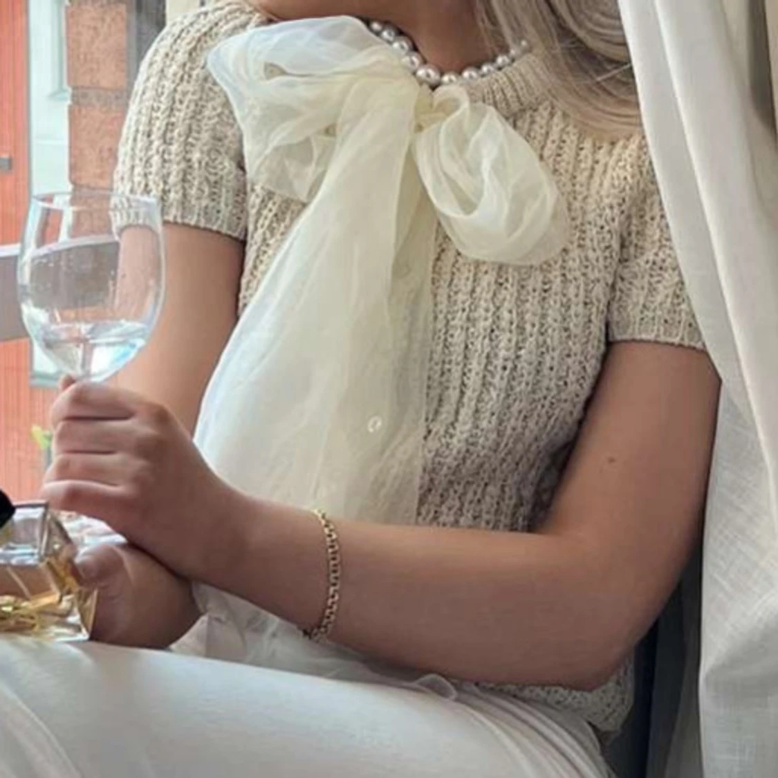Supersöt beige stickad kofta med kort ärm och knappar framtill. Koftan har en stor, transparent rosett vid halsen som ger en extra feminin touch. Perfekt att styla med smycken och ljusa jeans för en chic look.