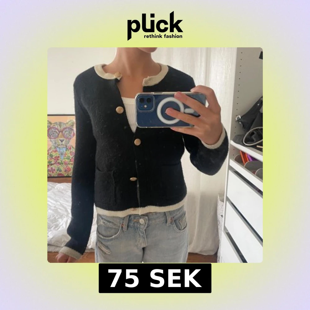 Snygg svart kofta från Zara med kontrasterande vita kanter vid hals, ärmslut och nederkant. Koftan har guldfärgade dekorativa knappar och två fickor framtill. Stickad i mjukt material och har en klassisk, lite kortare passform som är lätt att styla med jeans.