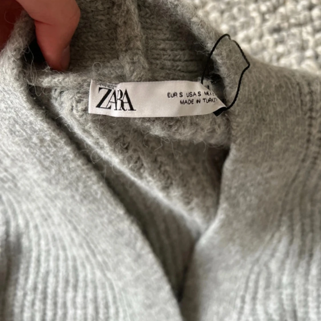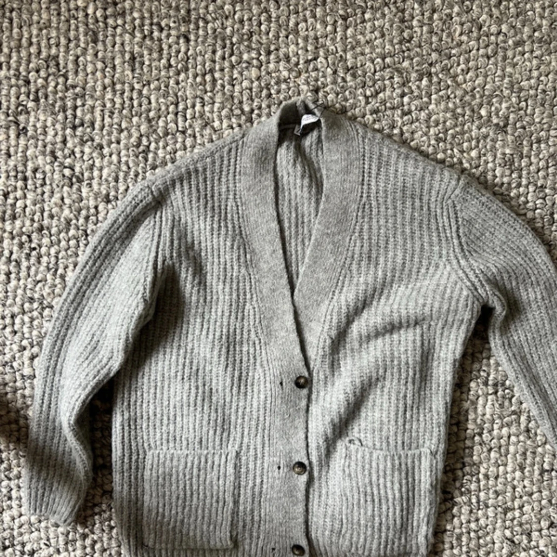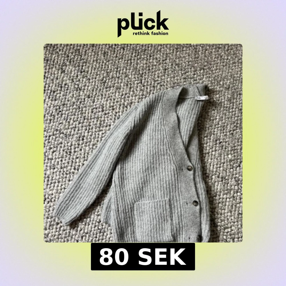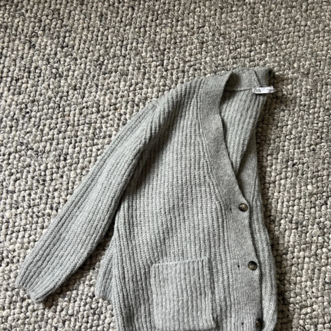 Mysig grå stickad kofta från Zara med djup v-ringning, stora framfickor och knappar framtill. Perfekt för lager-på-lager och chill dagar. Tjock ribbstickad struktur som ger en avslappnad vibe.