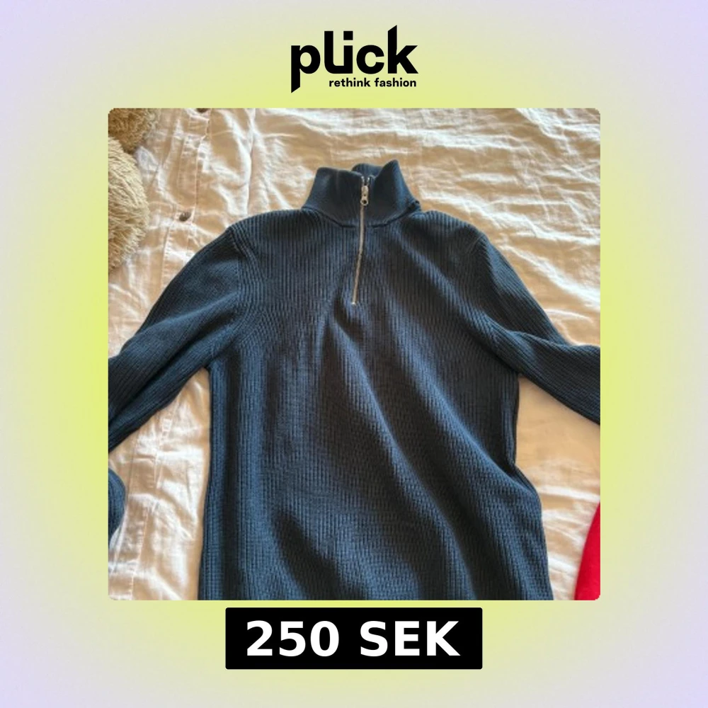 Säljer en mörkblå stickad tröja med hög krage och half zip-dragkedja. Tröjan har ribbad struktur och långa ärmar, perfekt för lager på lager under kyliga dagar. Enkel och stilren design som funkar till det mesta. Den är även lite stor i storleken