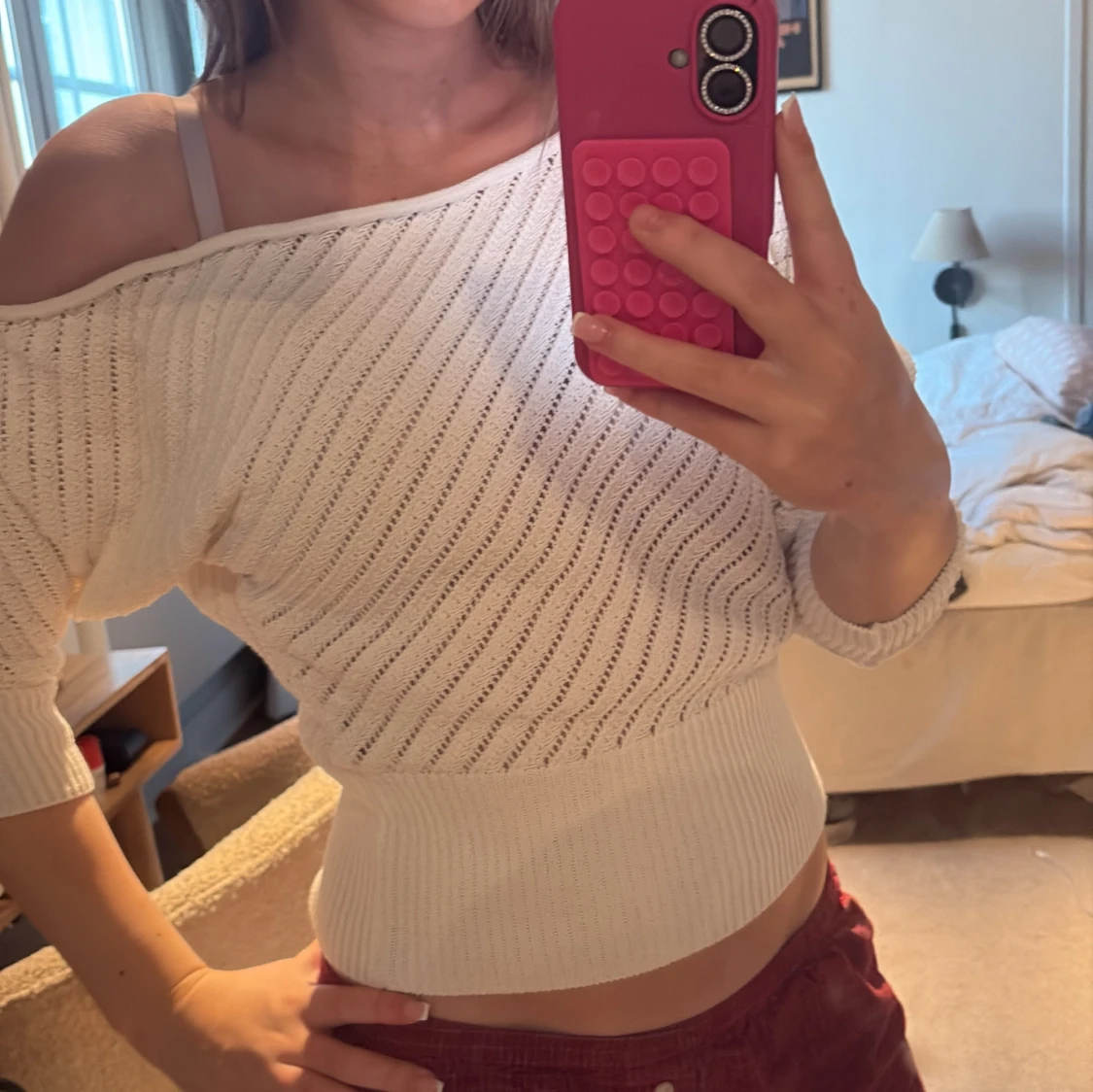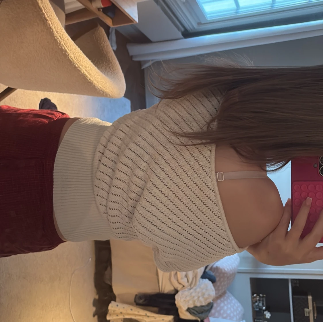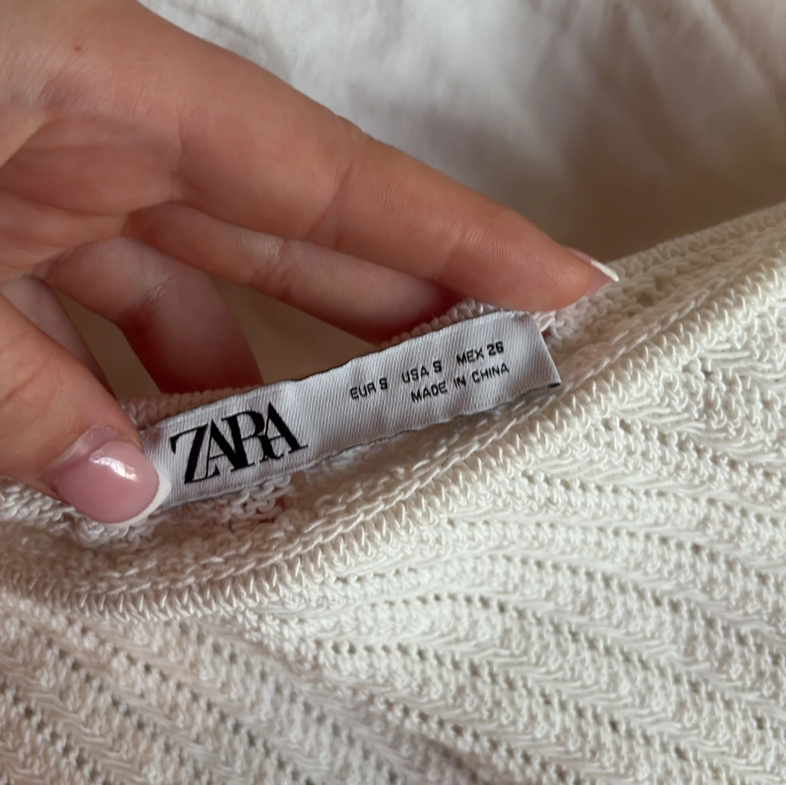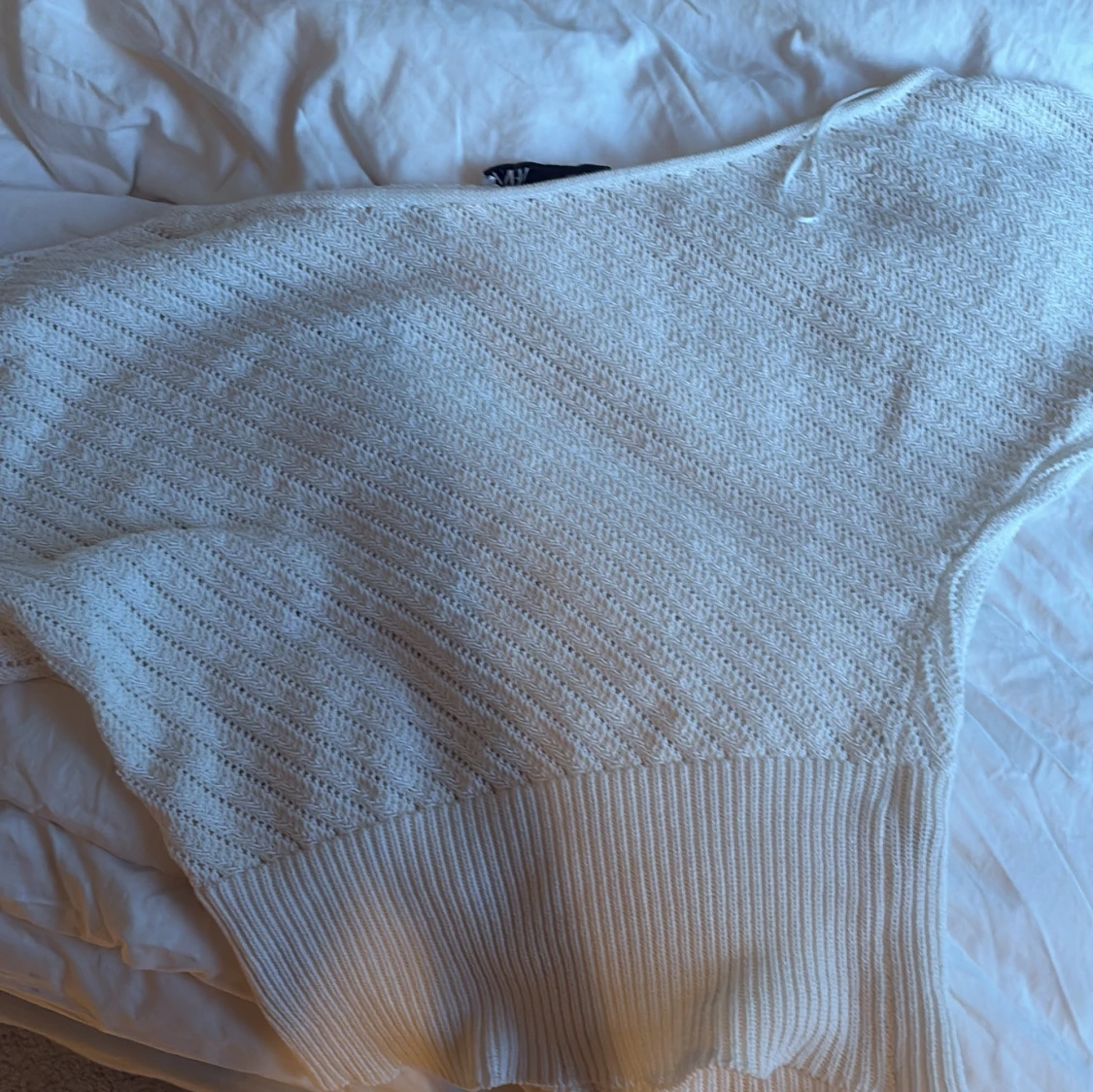 Superfin vit stickad tröja från Zara med offshoulder och trekvartsärm. Tröjan har ett ribbat midjeband och ett diskret randigt mönster i stickningen. Perfekt för dig som gillar en lite loose och avslappnad stil.