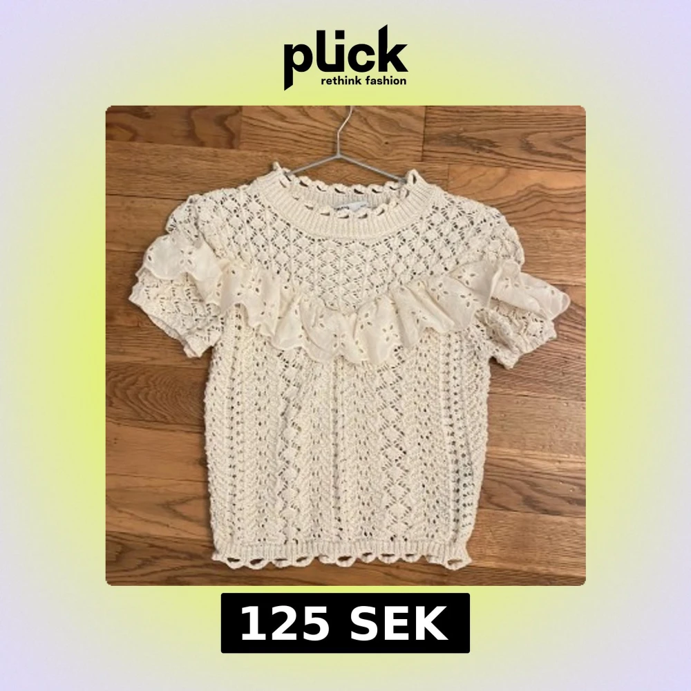 Säljer en söt beige stickad topp från Zara med vackra spetsdetaljer och volanger. Toppen har korta ärmar och ett fint hålmönster som ger en romantisk känsla. Naturvit färg 🌸