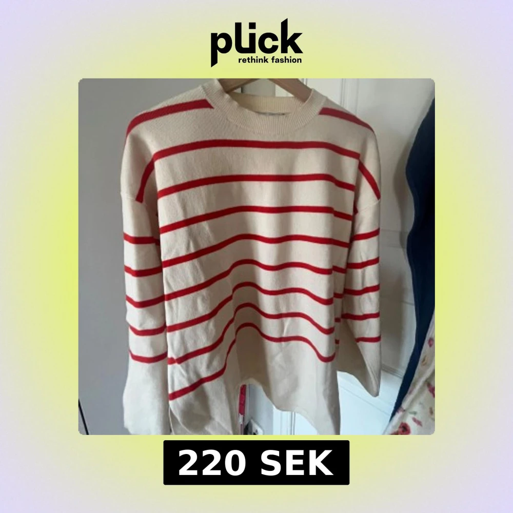 Säljer en snygg randig tröja i rött och vitt. Tröjan har långa ärmar och en rund halsringning. Perfekt för en avslappnad stil.