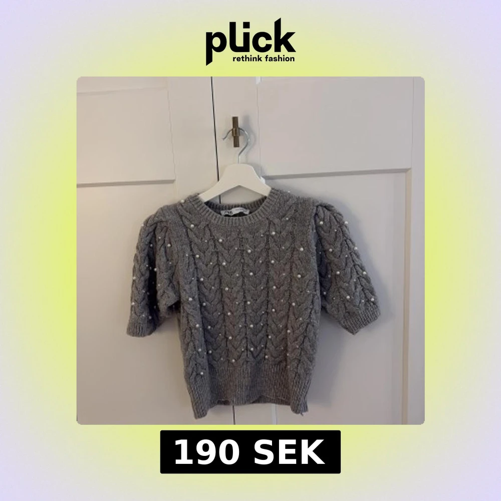 Superfin grå stickad tröja från Zara med korta puffärmar och pärldetaljer över hela tröjan. Snyggt kabelstickat mönster och ribbade muddar vid ärmslut och nederkant. Perfekt för dig som vill ha något extra till hösten eller vintern.
