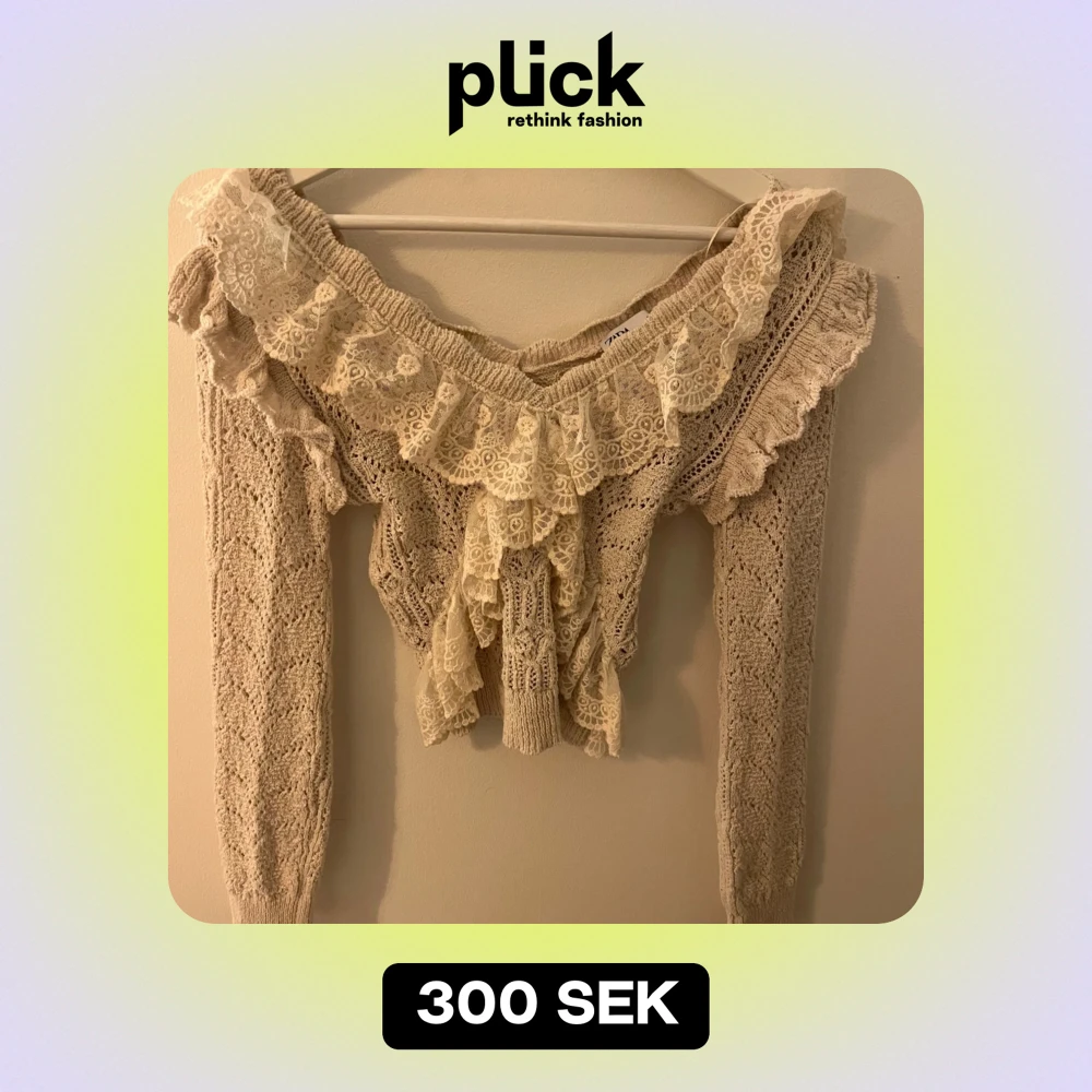 Superfin beige stickad tröja från Zara med vackra spetsdetaljer och volang runt halsen. Perfekt för höst och vår, den har långa ärmar och en romantisk stil. Passar både till vardags och festliga tillfällen. 🧡 Använd fåtal gånger, säljer för att den inte används!