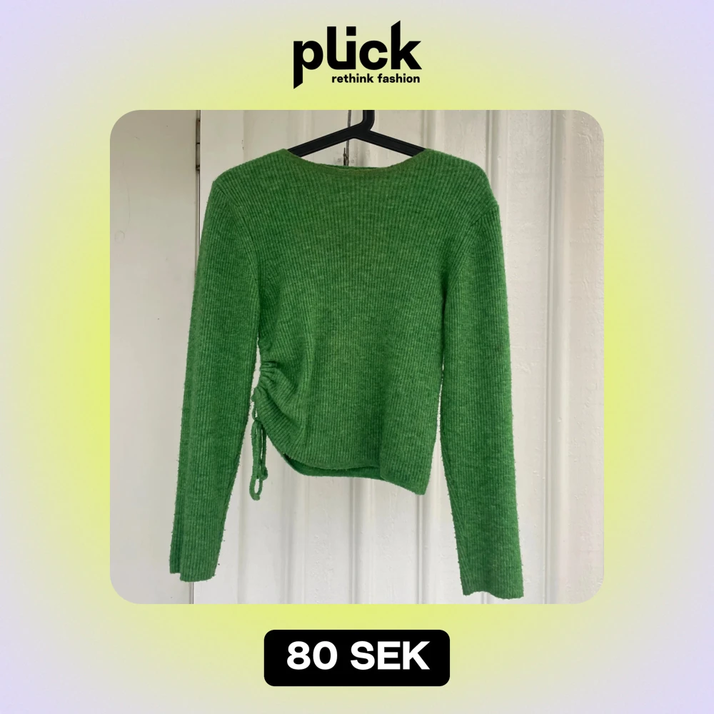Grön ribbstickad tröja med fin knytning i sidan🫶 Storleken är L men jag är XS och den har passat mig jättebra!