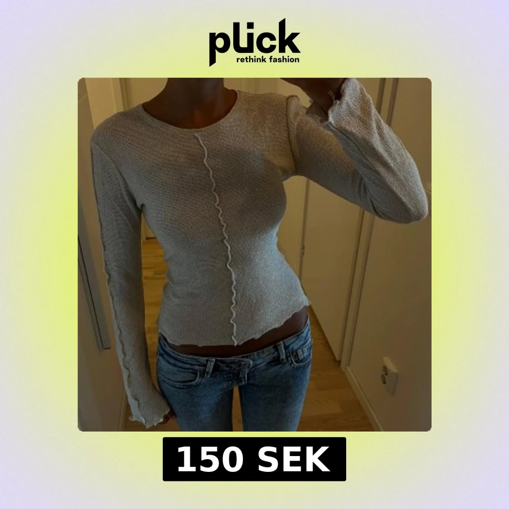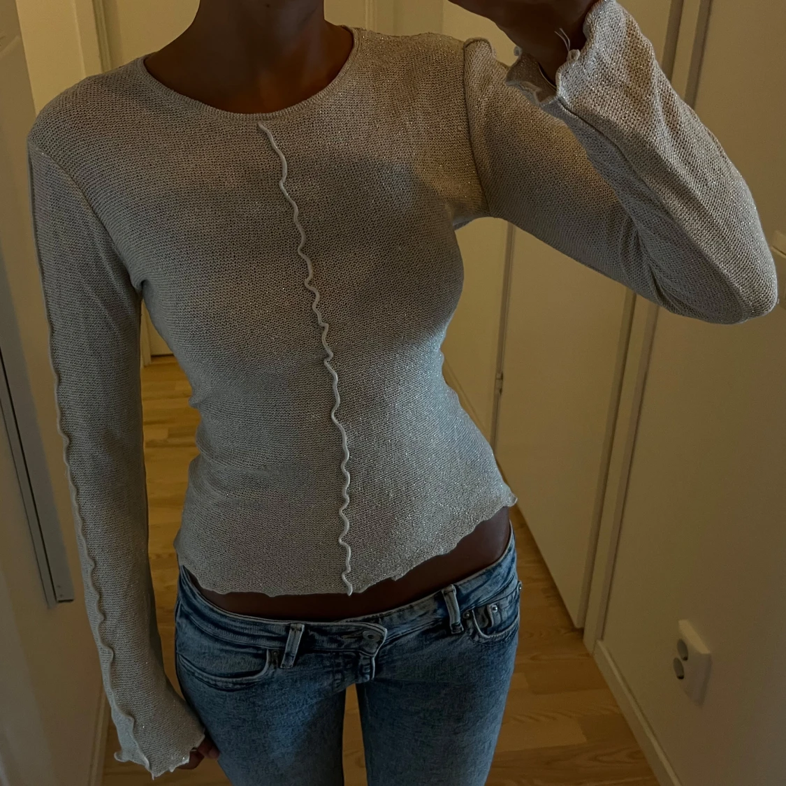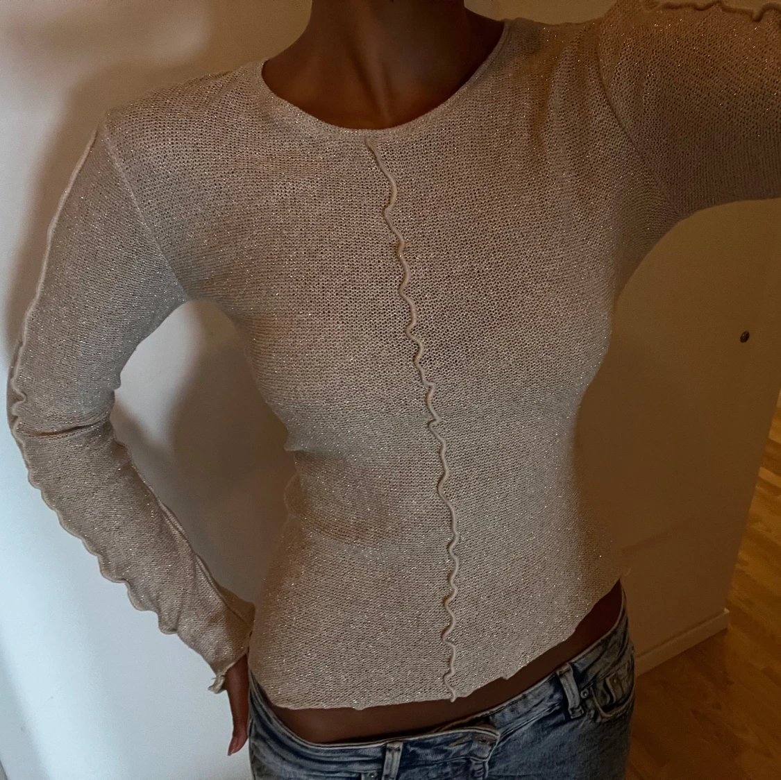 Supersnygg beige långärmad topp med glittrigt material och vågiga sömmar framtill och längs ärmarna. Figurnära passform och rund halsringning.