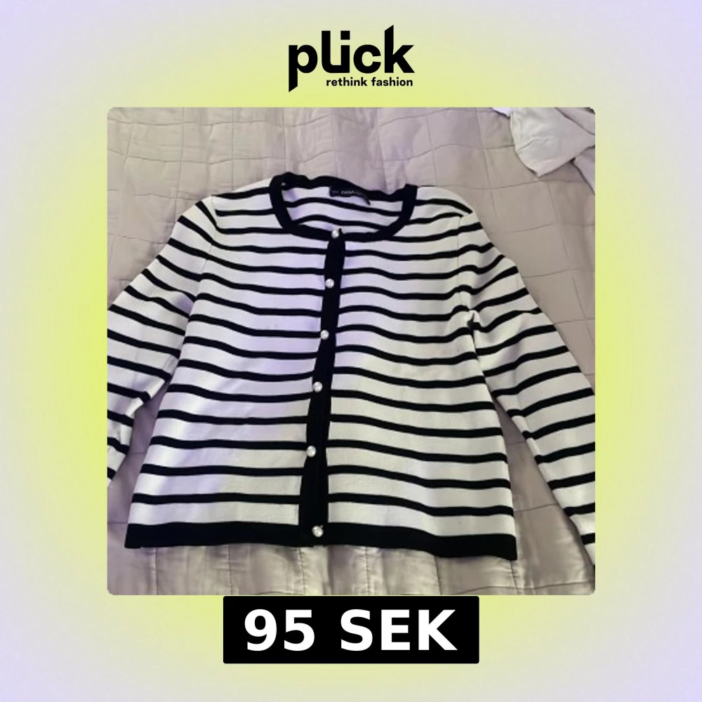 Snygg svartvit randig kofta från Zara i stickad kvalitet. Koftan har långa ärmar, rund halsringning och dekorativa pärlknappar framtill. Perfekt för dig som gillar klassisk stil med en twist. Passar till både jeans och kjol.