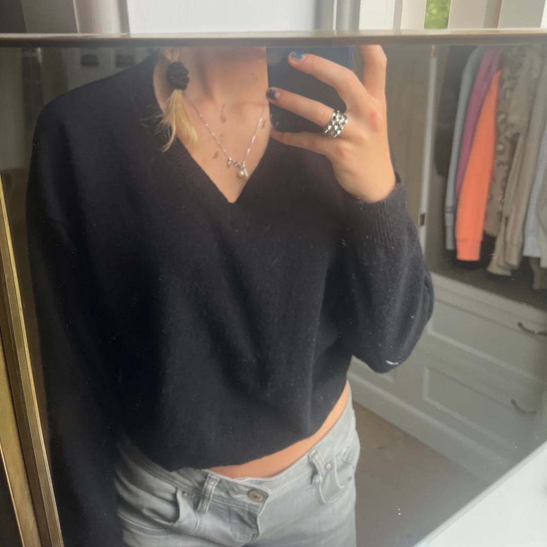 Stickad svart v-ringad tröja från zara!!! Köparen står för frakten. Säljer pågrund av att den ej kommer till användning❤️ . Pris kan diskuteras! Köpt för 299!