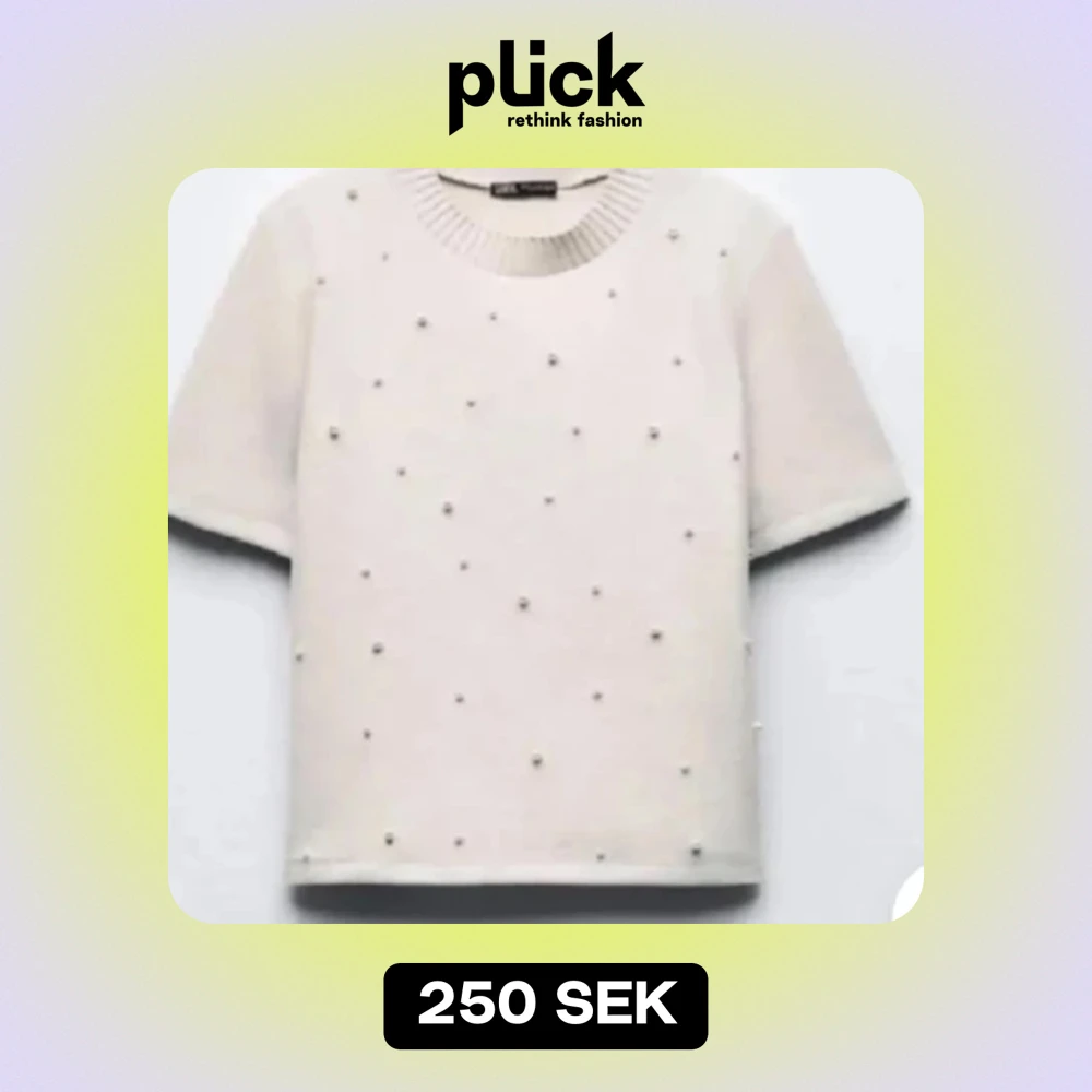 Säljer en superfin vit tröja från Zara med korta ärmar och dekorerad med små pärlor över hela framsidan. Perfekt för en stilren och elegant look. Tröjan är i ett mjukt material och har en normal passform. Perfekt för både vardag och fest!