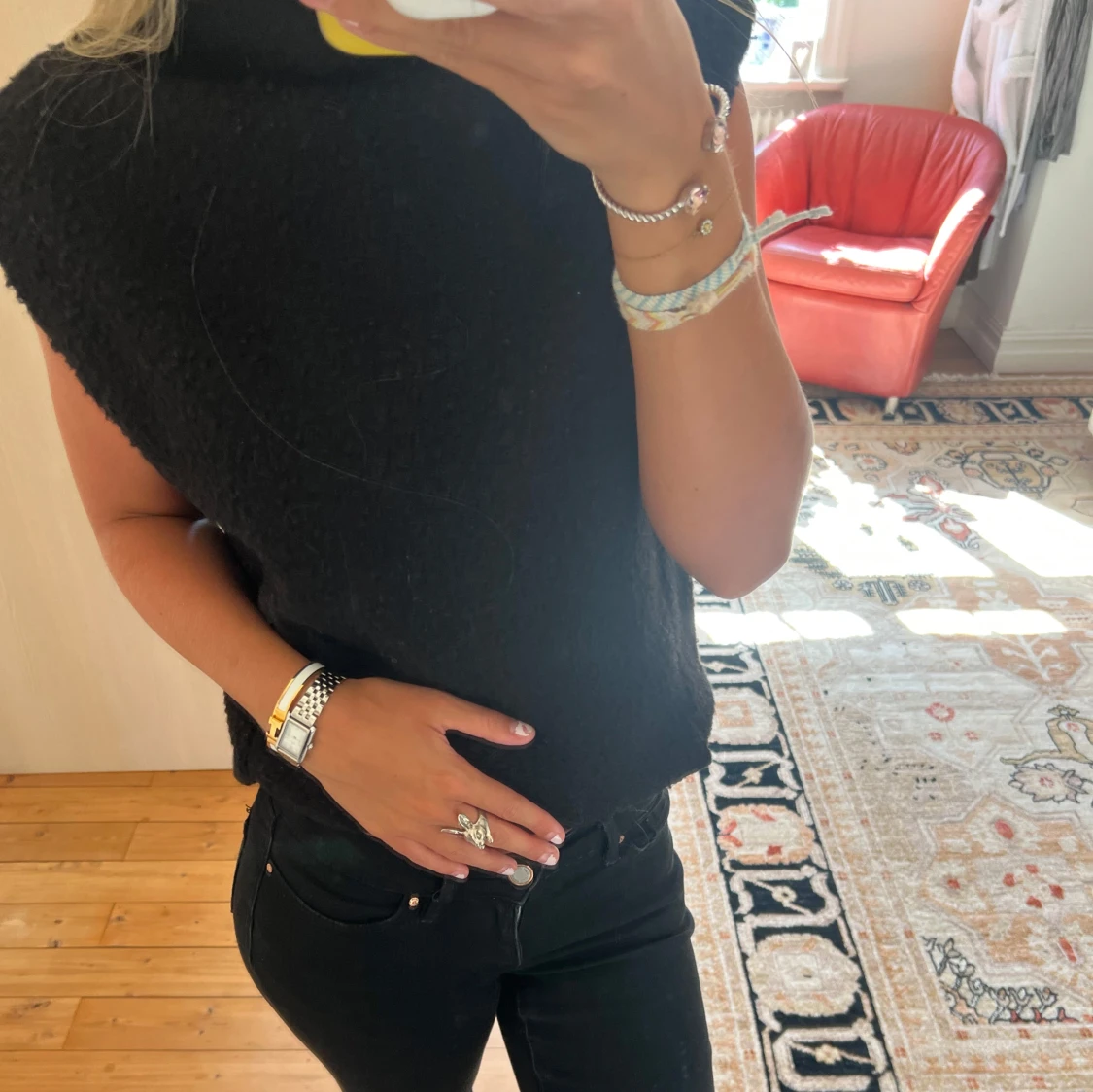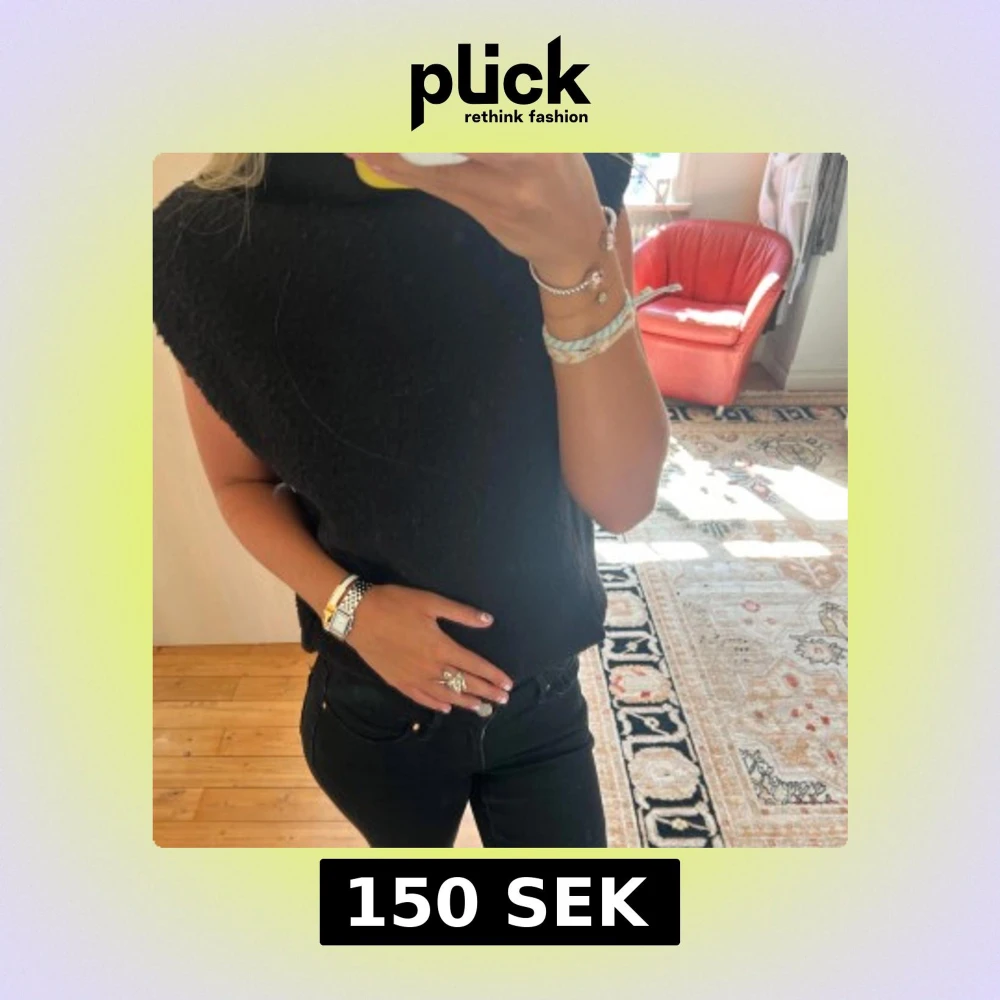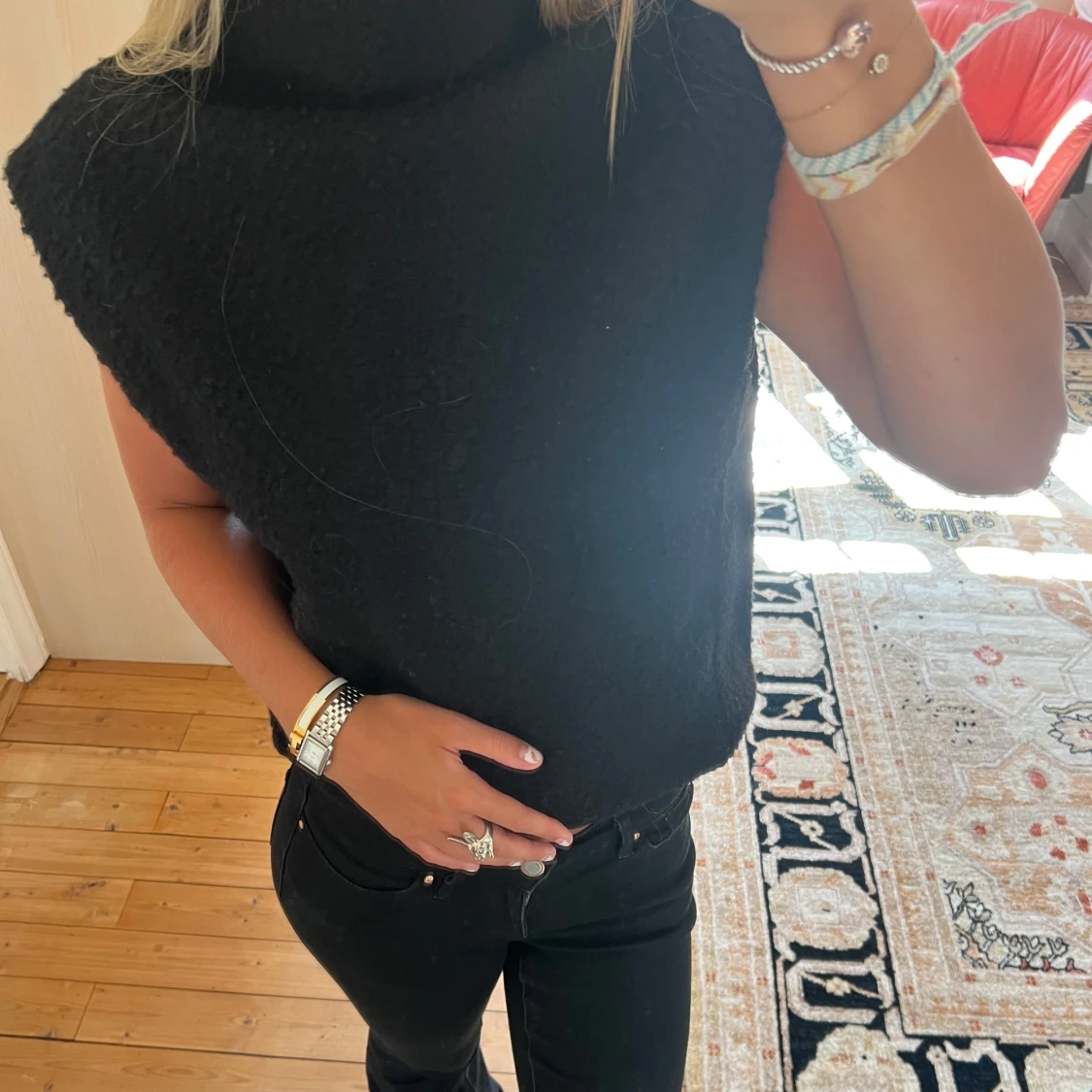 Säljer en svart stickad polotröja med hög krage och ärmlös design. Tröjan har en grovstickad struktur som ger en cool och trendig look. Perfekt att styla med jeans eller över en skjorta för en snygg layering-effekt.💛