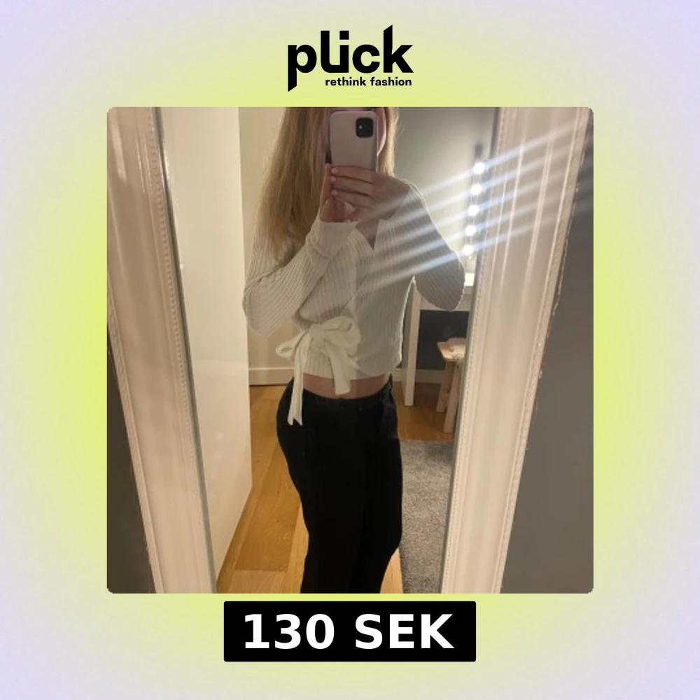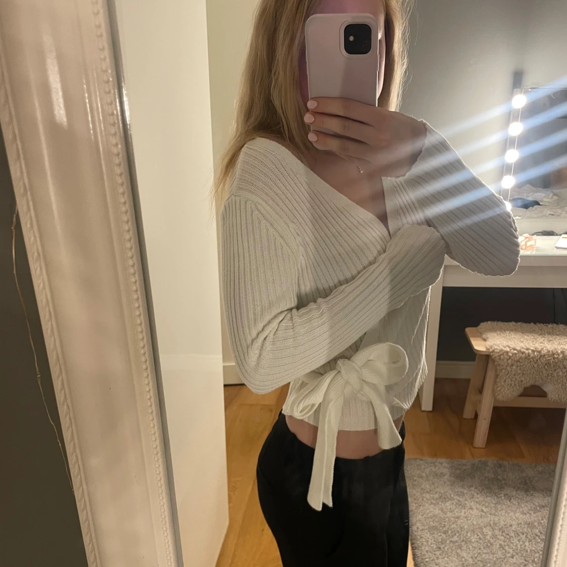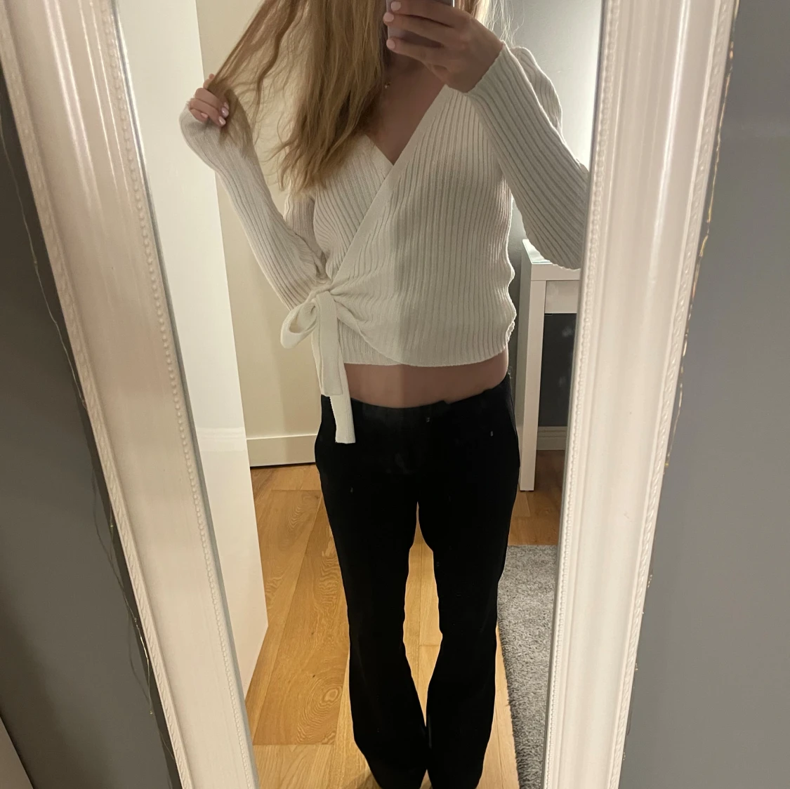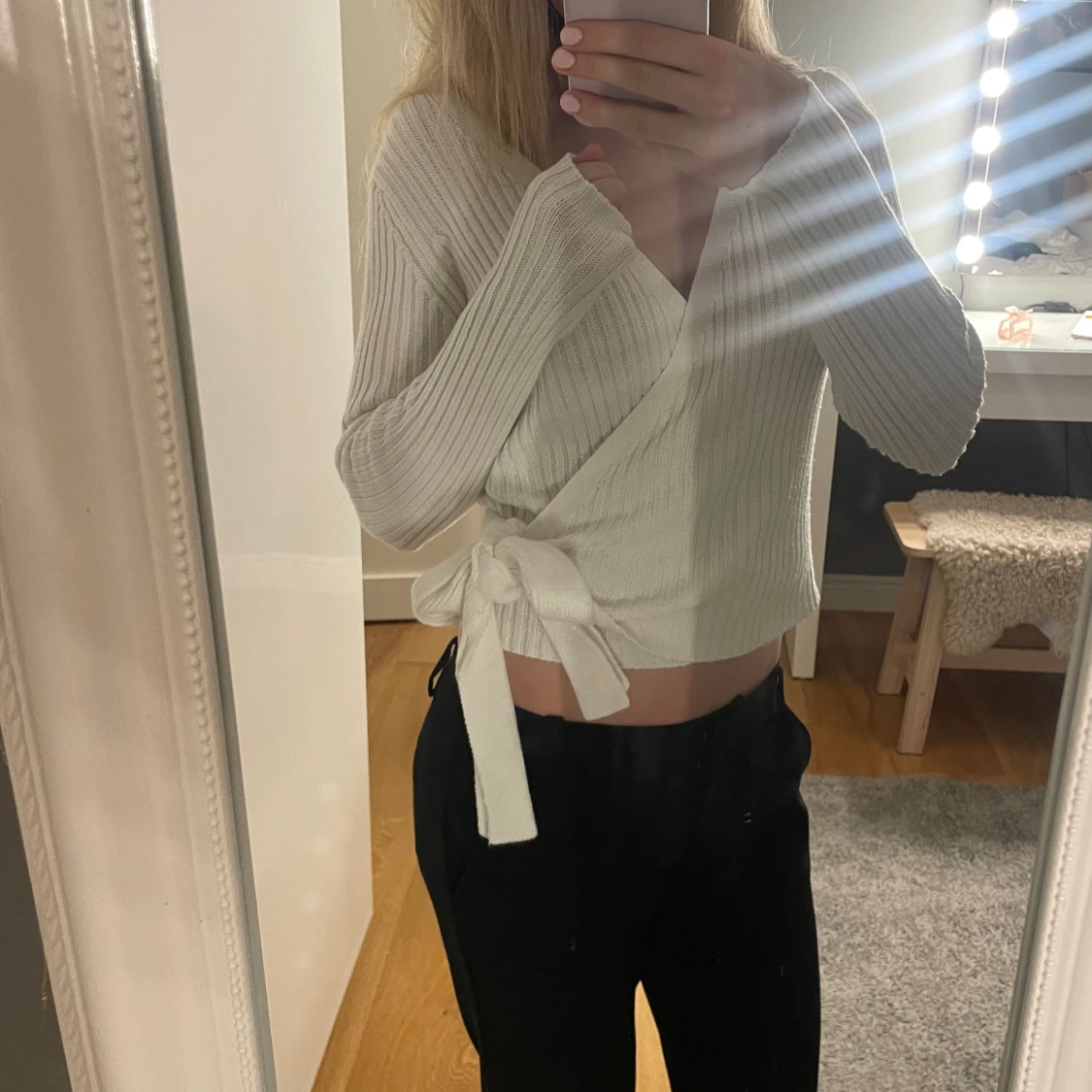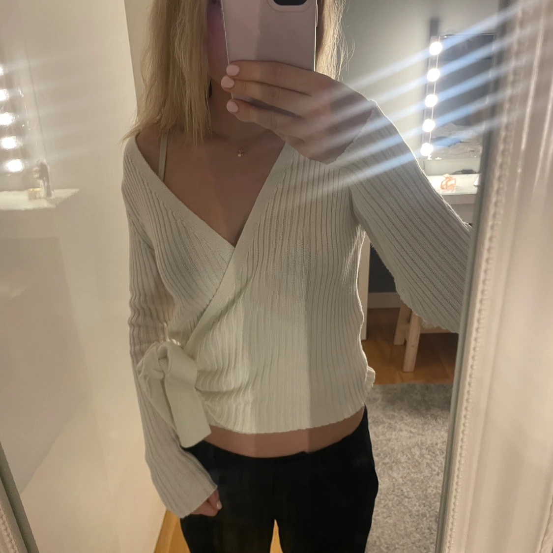 Säljer en superfin vit omlott kofta med ribbad struktur och knyt i sidan. Tröjan är croppad, har lång ärm och v-ringad hals. Perfekt att styla med både jeans och kjol för en trendig look.