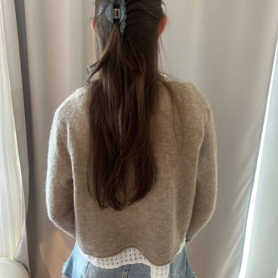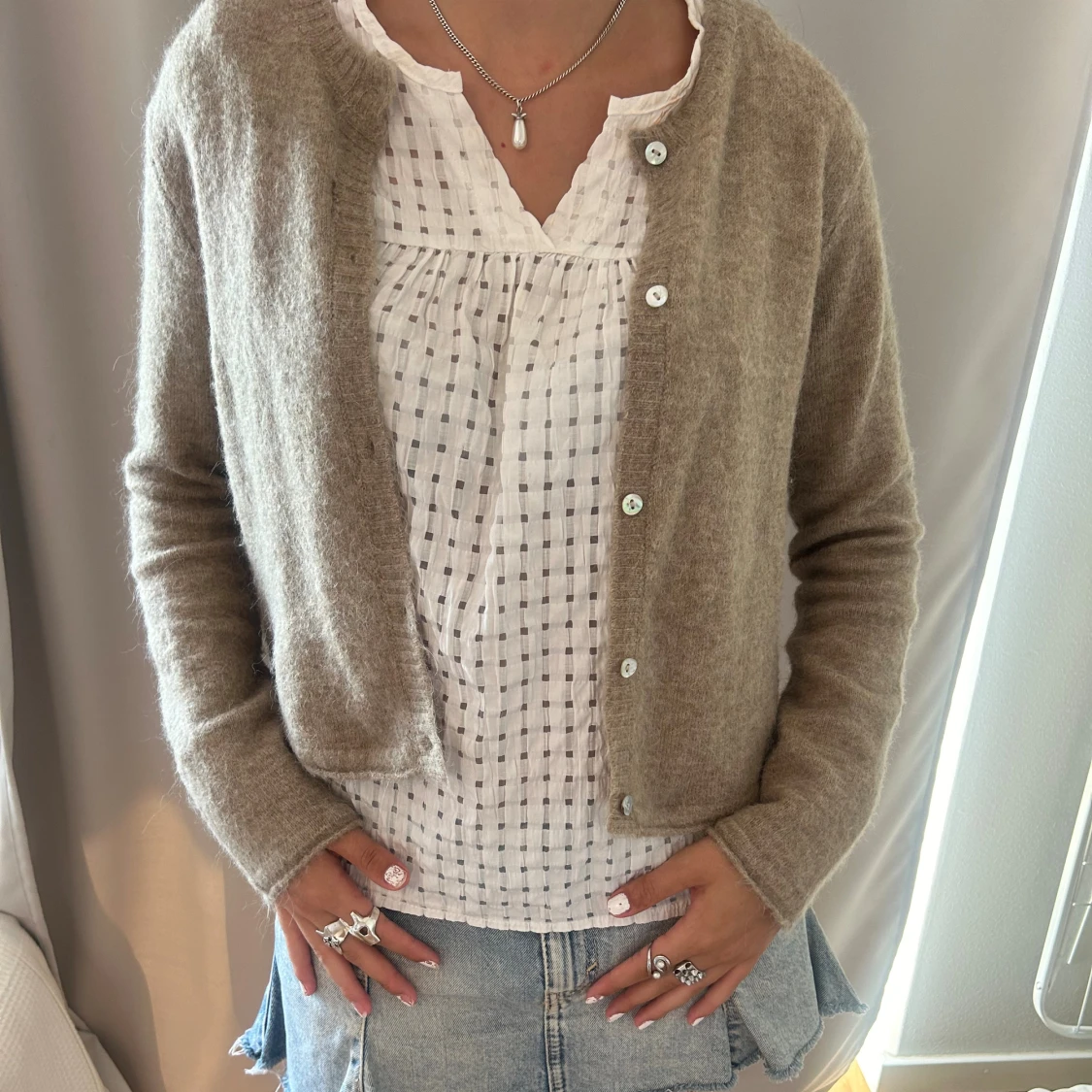 Supermysig beige stickad kofta med rund hals och knäppning framtill. Koftan är croppad och har långa ärmar, perfekt att slänga över en topp eller klänning. Enkel och stilren design som passar till jeans eller kjol.