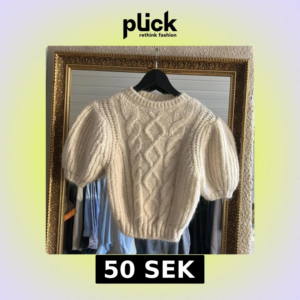 Säljer en superfin vit stickad tröja från Zara med puffiga ärmar och ett snyggt flätmönster framtill. OANVÄND