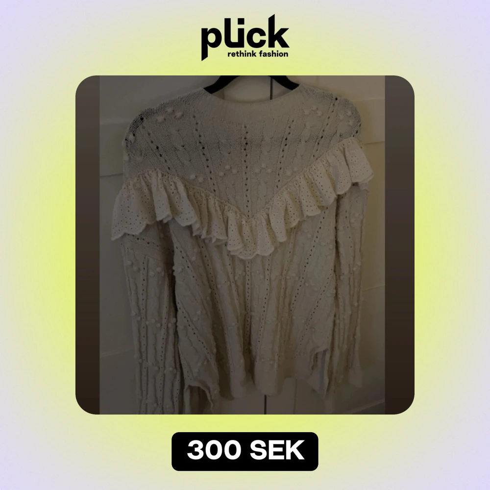 Superfin vit stickad tröja med volangdetaljer och ett snyggt hålmönster. Perfekt för höst och vinter, den är både mysig och stilren. Långärmad med en unik design som verkligen sticker ut. Passar perfekt till både jeans och kjol! Den är från Zara och tror inte den säljs längre💞