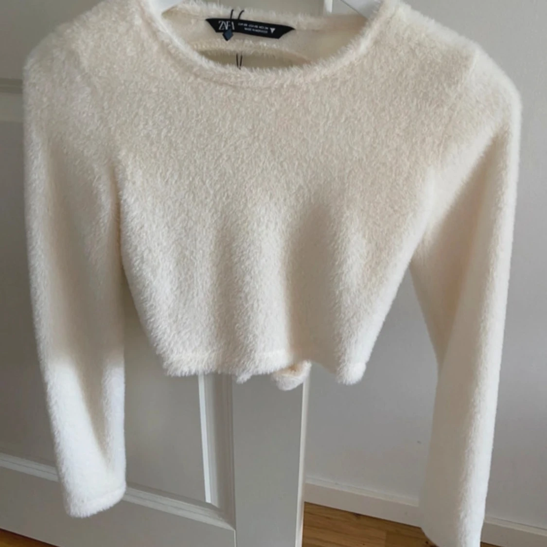 Superfin vit stickad croppad topp från Zara. Helt ny, prislappen sitter kvar. Säljer då den aldrig kommit till användning💕