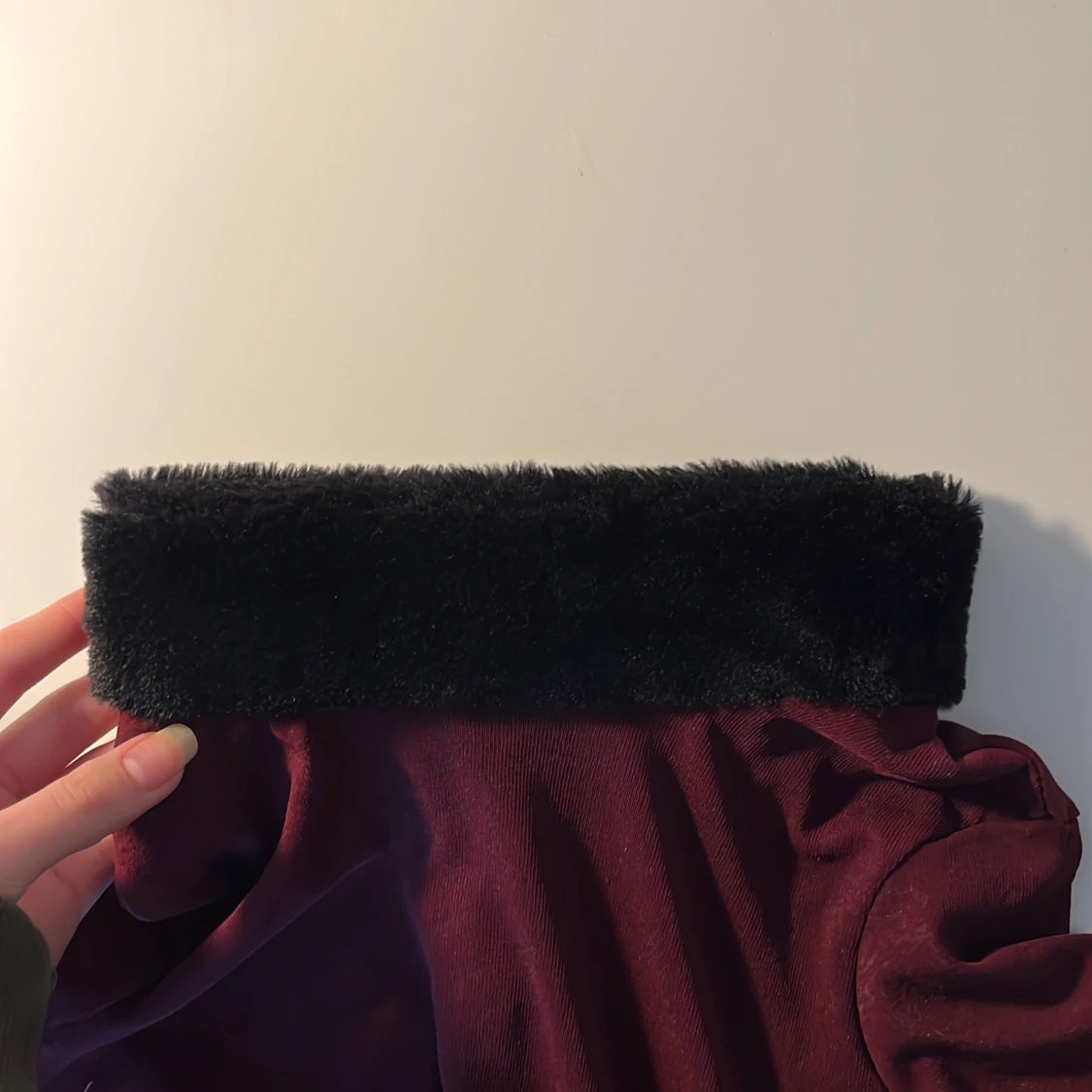 Vinröd, lite genomskinlig Stor svart, fluffig krage, och dragkedja i ryggen Inga defekter, topp skick