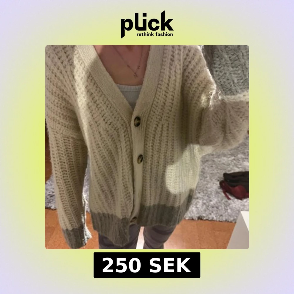 Mysig stickad kofta i beige och grått med stora knappar framtill. Perfekt för kyliga dagar med sin avslappnade passform och långa ärmar.