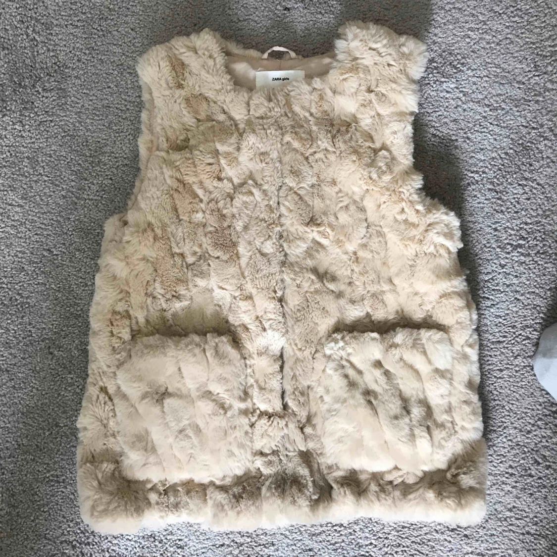 En fuskpäls väst från zara. Den är i barnstorlek men sitter väldigt bra som en vuxen S. Den är jätteskön med två fickor framtill. Kan mötas upp i stockholm eller frakta (köparen står för frakt)