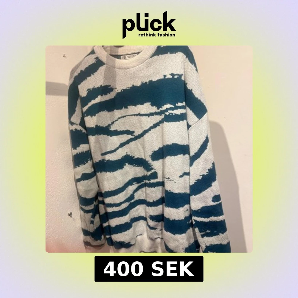 Säljer en stickad tröja från Zara med coolt zebramönster i vitt och mörkgrönt. Tröjan har rund halsringning och långa ärmar, perfekt för dig som vill sticka ut lite extra. Skön och avslappnad passform.