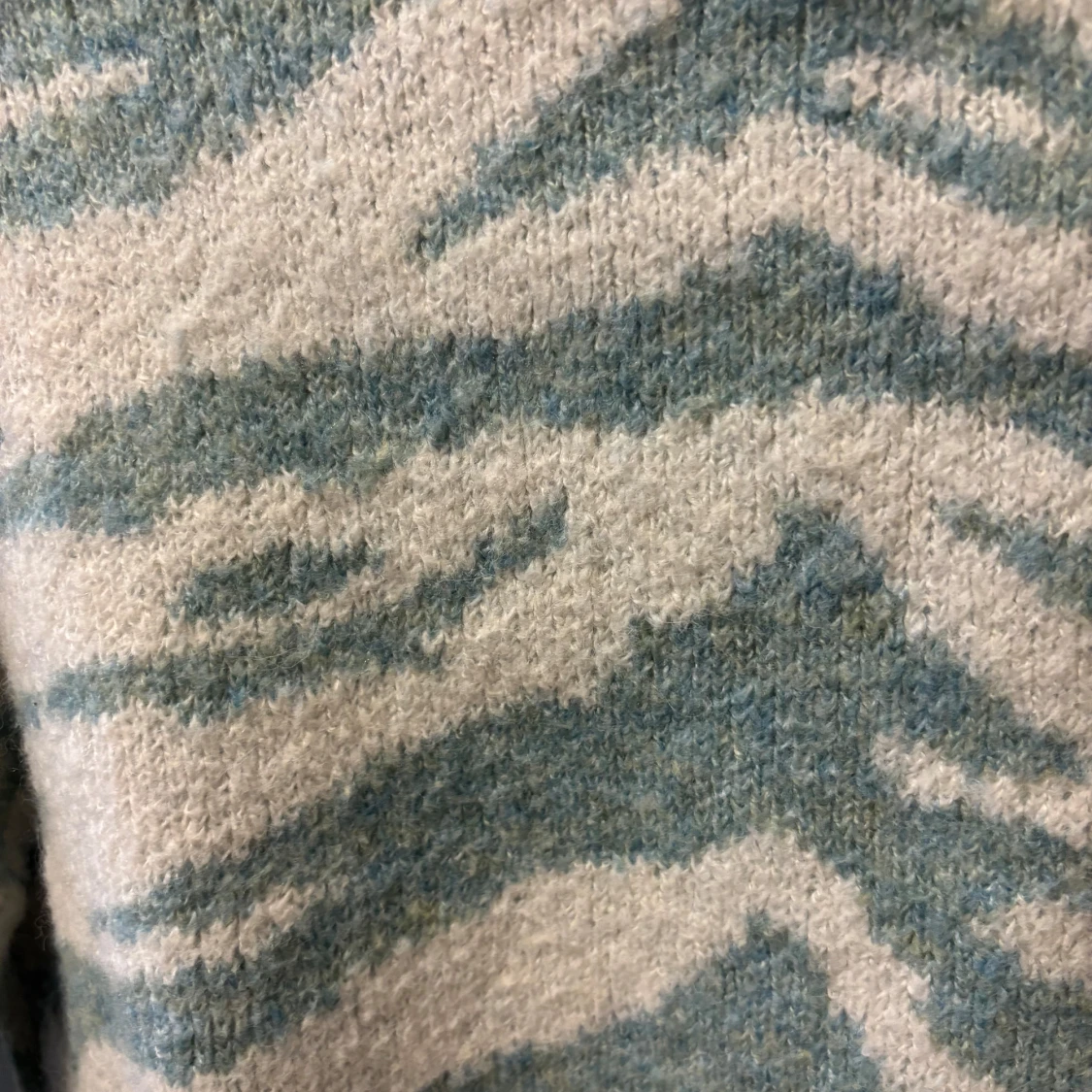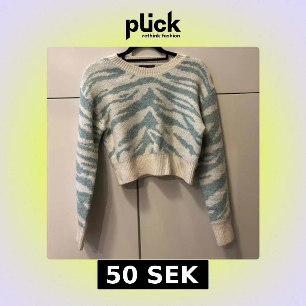 Säljer en supermjuk, croppad, stickad tröja med zebramönster i ljusblått/turkos och vitt. Perfekt till ett par jeans eller på myskvällen! Storlek S.