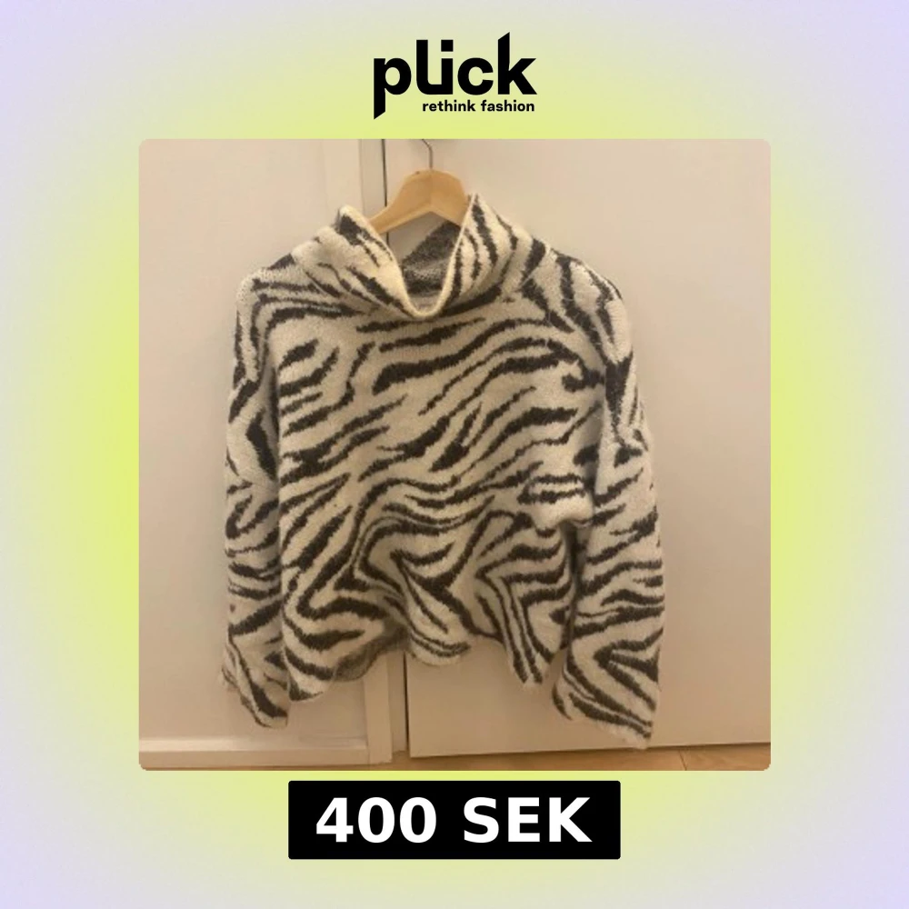 Säljer en mysig zebramönstrad tröja med polokrage. Tröjan har en loose passform och är perfekt för kyligare dagar. Den är i svart och vit färg och har långa ärmar.