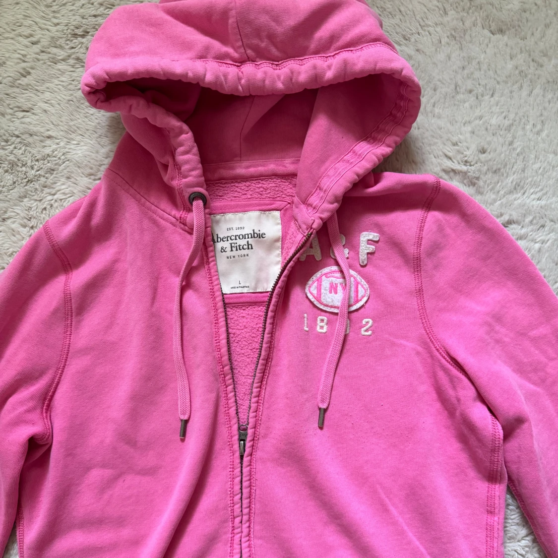 Säljer en rosa hoodie från Abercrombie & Fitch med dragkedja och huva. Tröjan har broderad logga och text på bröstet, snörning i huvan och två fickor framtill. Perfekt för en chill och avslappnad stil.