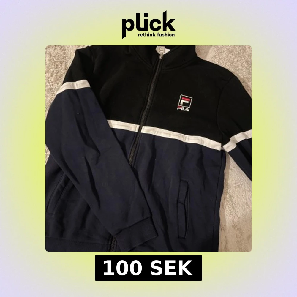Sportig zipjacka från FILA i svart och marinblått med vit rand över bröstet och armarna. Jackan har dragkedja framtill, ståkrage och två fickor. Perfekt för en avslappnad streetstyle-look. Knappt använd