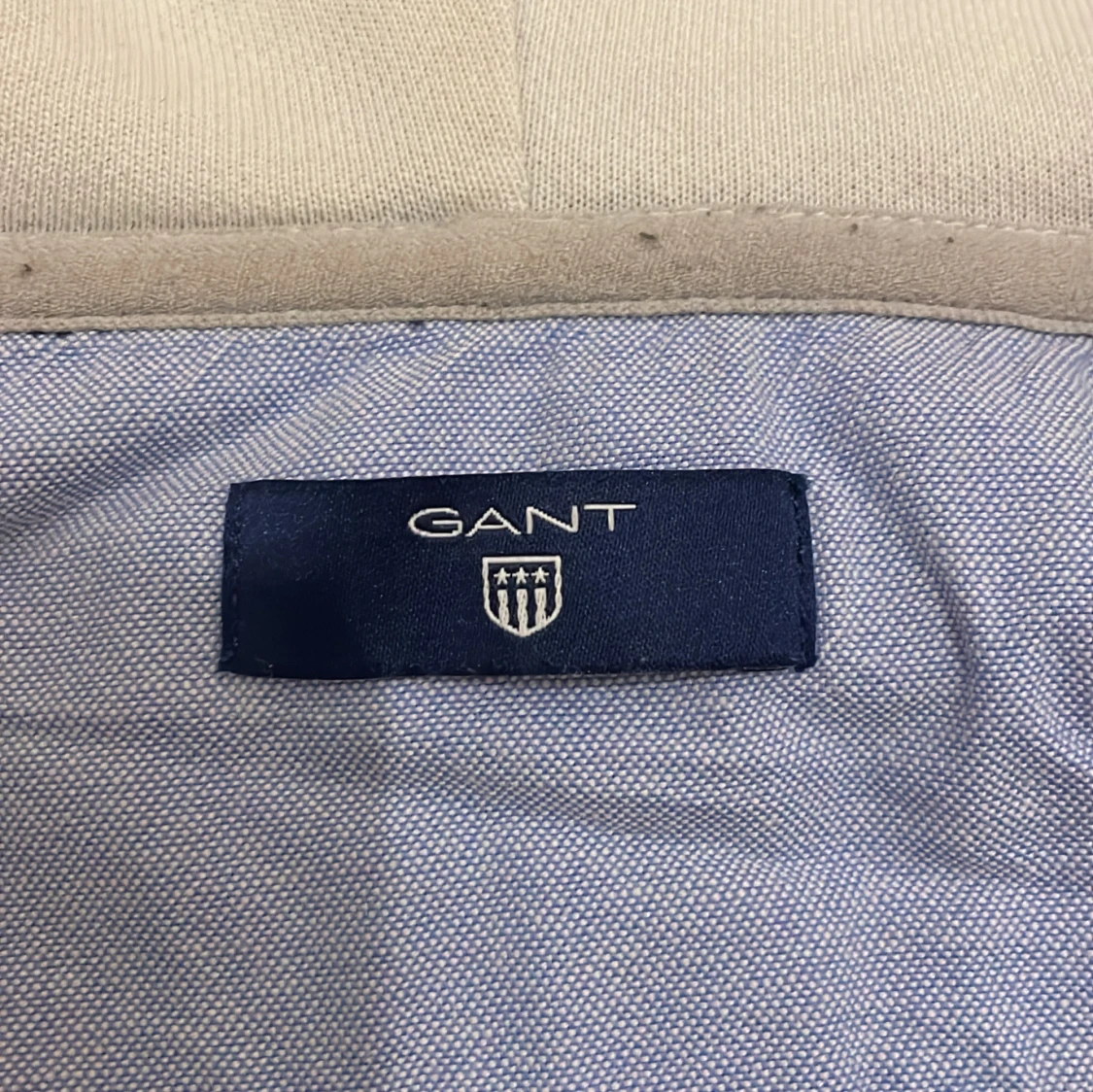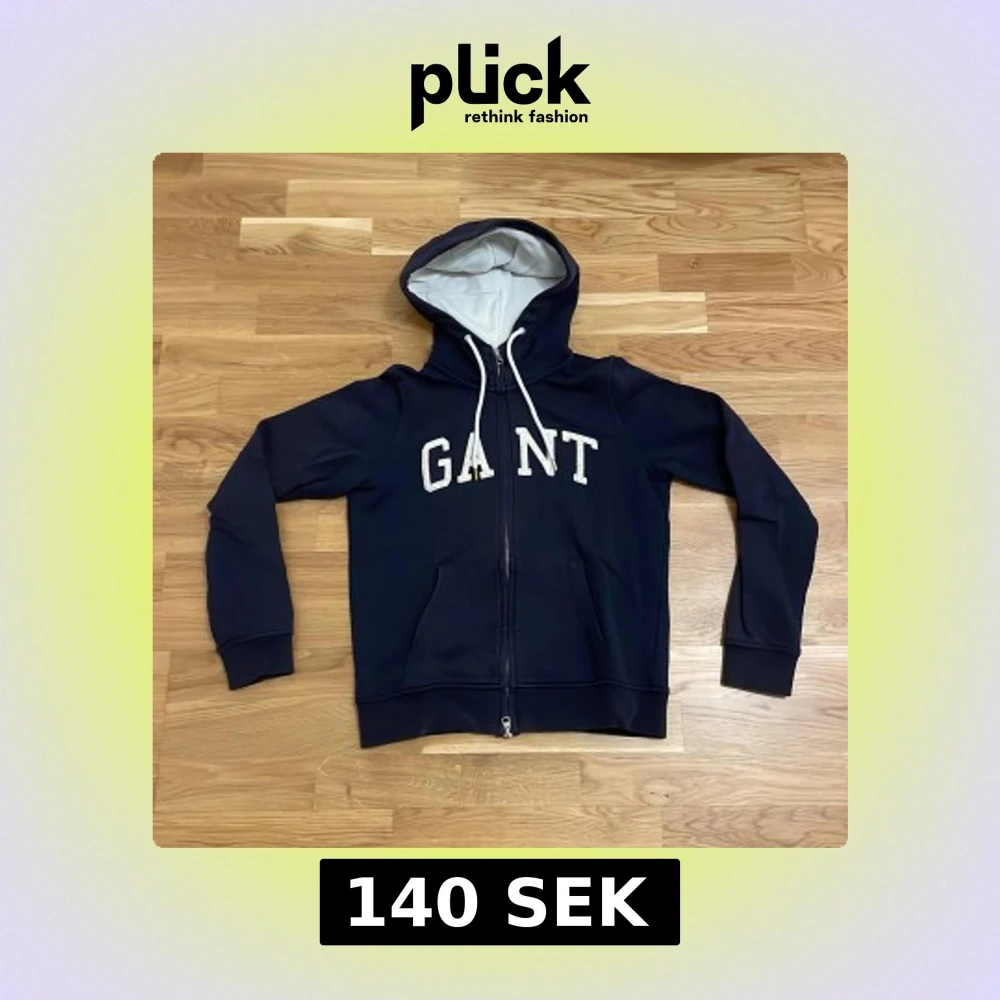 Säljer en snygg mörkblå hoodie från GANT med dragkedja och vit text på bröstet. Den har en justerbar huva med vita snören och långa ärmar. Aningens urtvettad. Perfekt för en avslappnad stil.