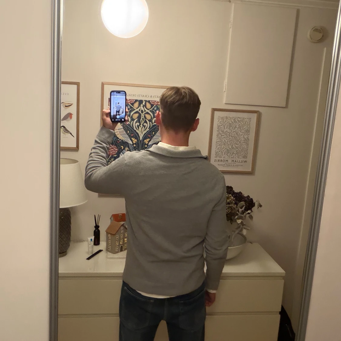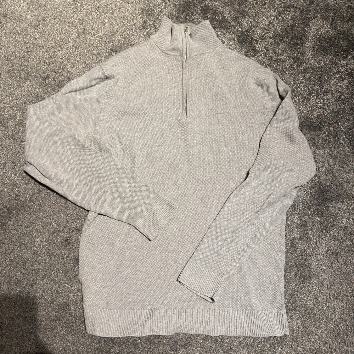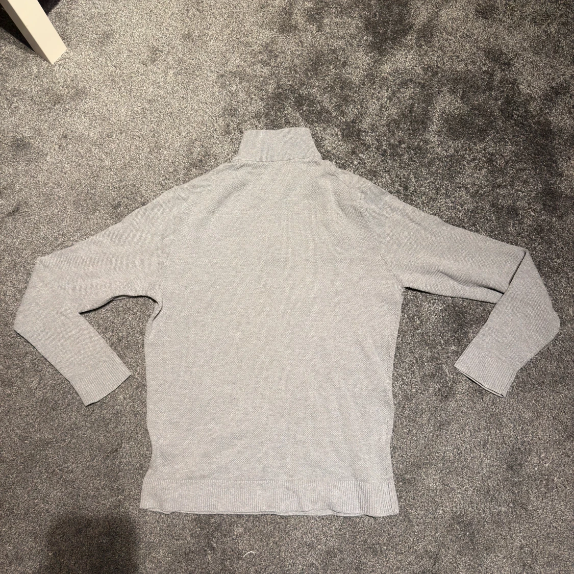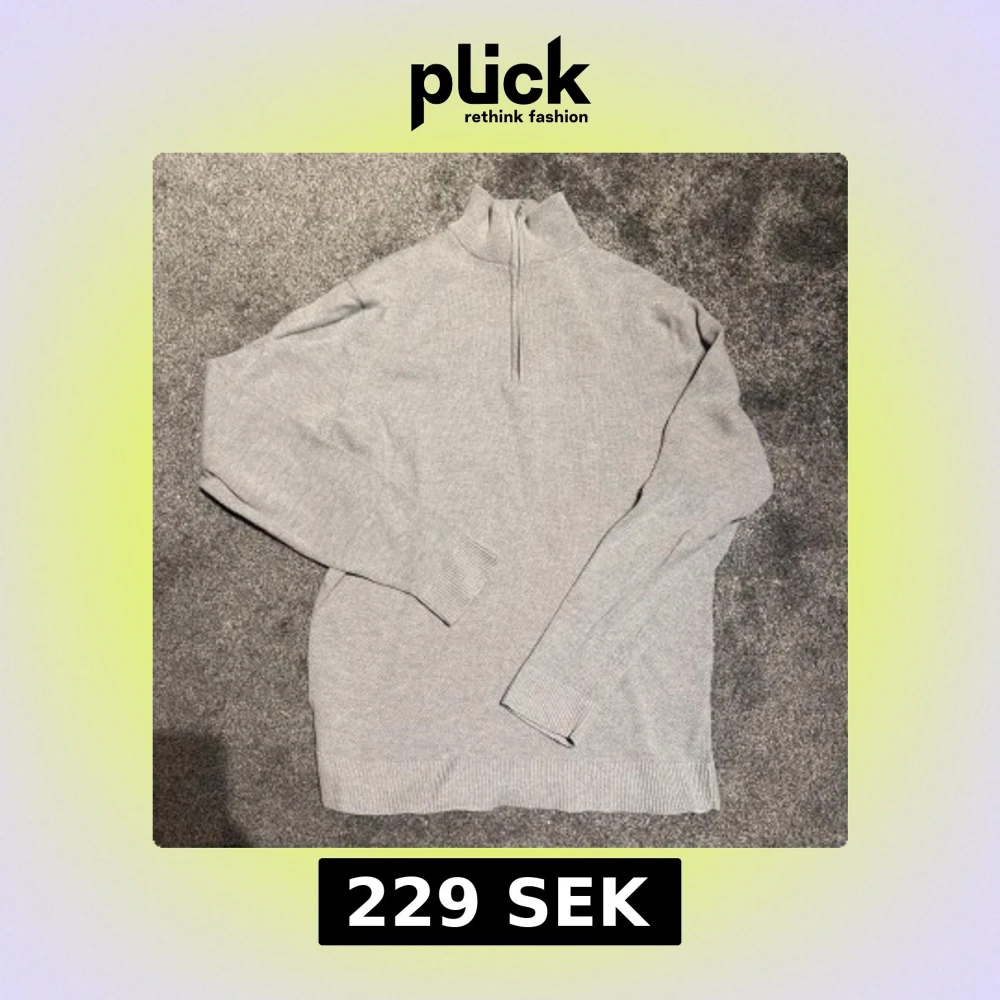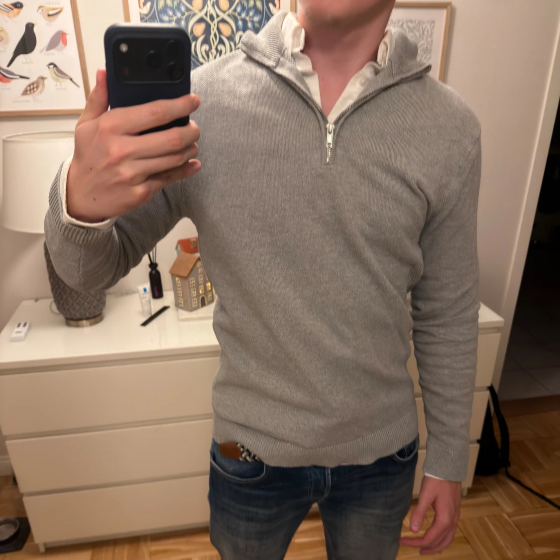 Snygg ljusgrå stickad tröja med half zip och hög krage. Tröjan har lång ärm och ribbade muddar vid ärmslut och nederkant. Perfekt att bära över en skjorta för en clean och stilren look.
