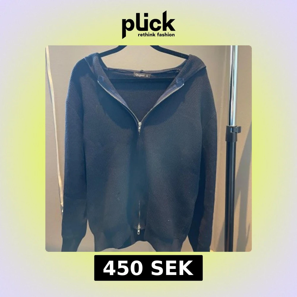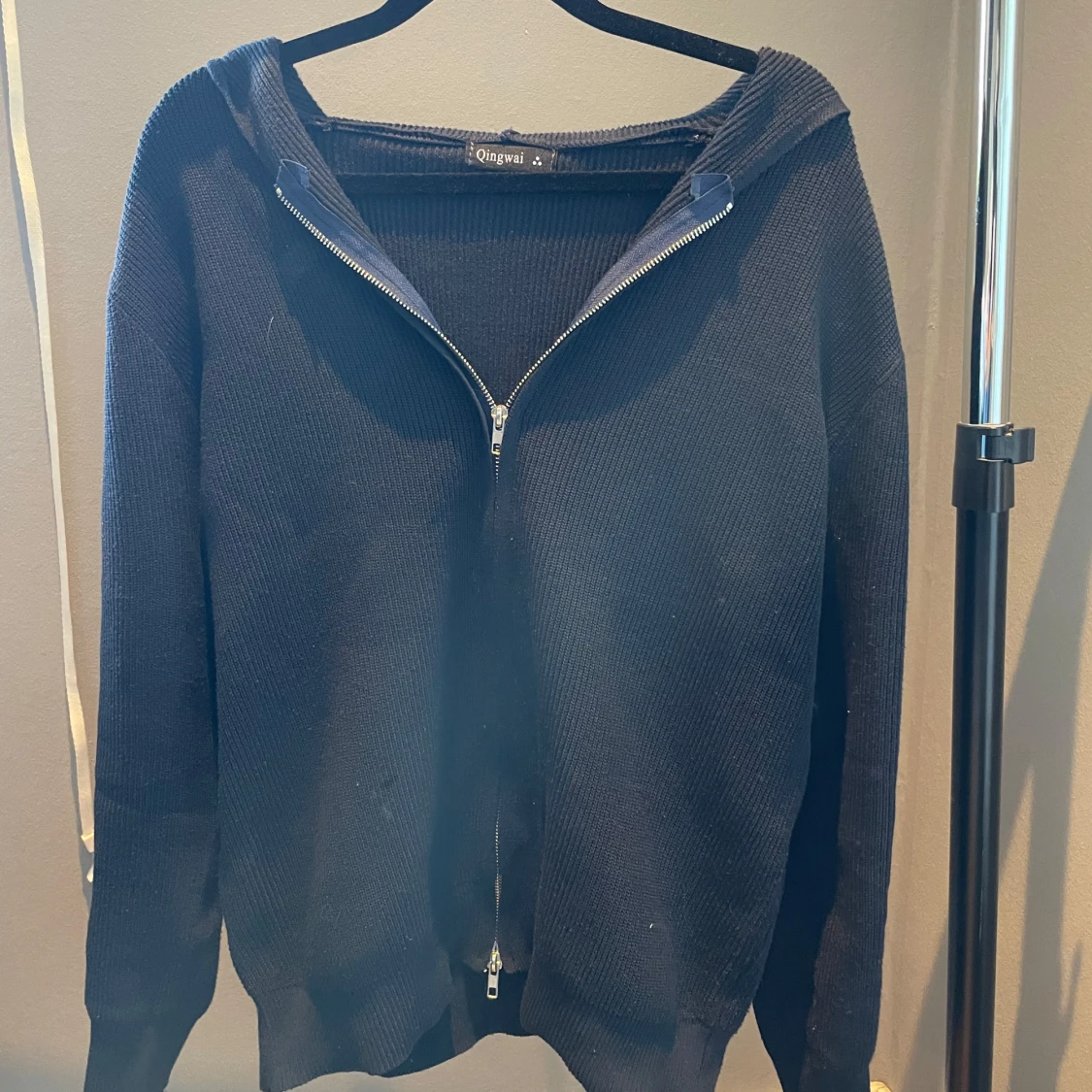 Mörkblå stickad hoodie med dragkedja framtill. Tröjan har långa ärmar och ribbade muddar vid ärmslut och nederkant. Perfekt för kyliga dagar och enkel att matcha med olika outfits. Tröjan är i jättebra skick men det ser ut att vara märken på tröjan på bilden men det är det inte.