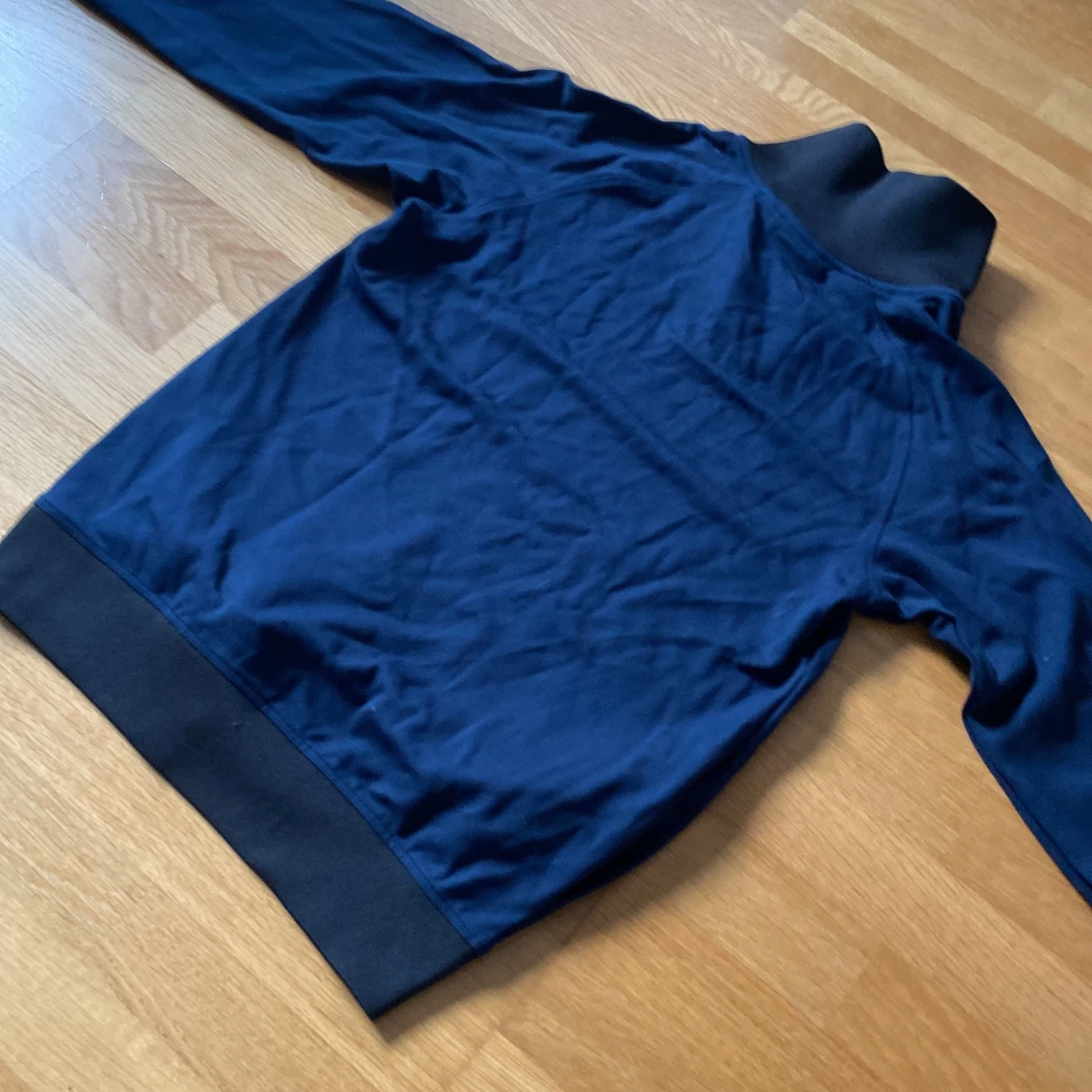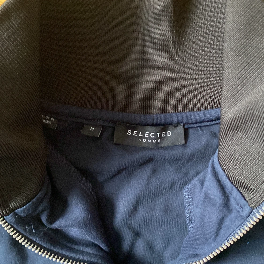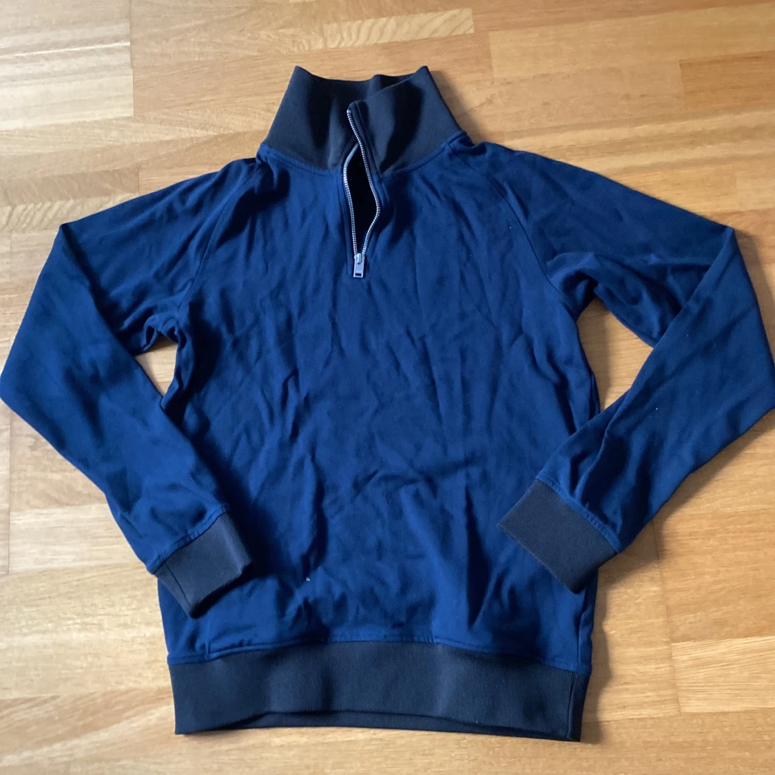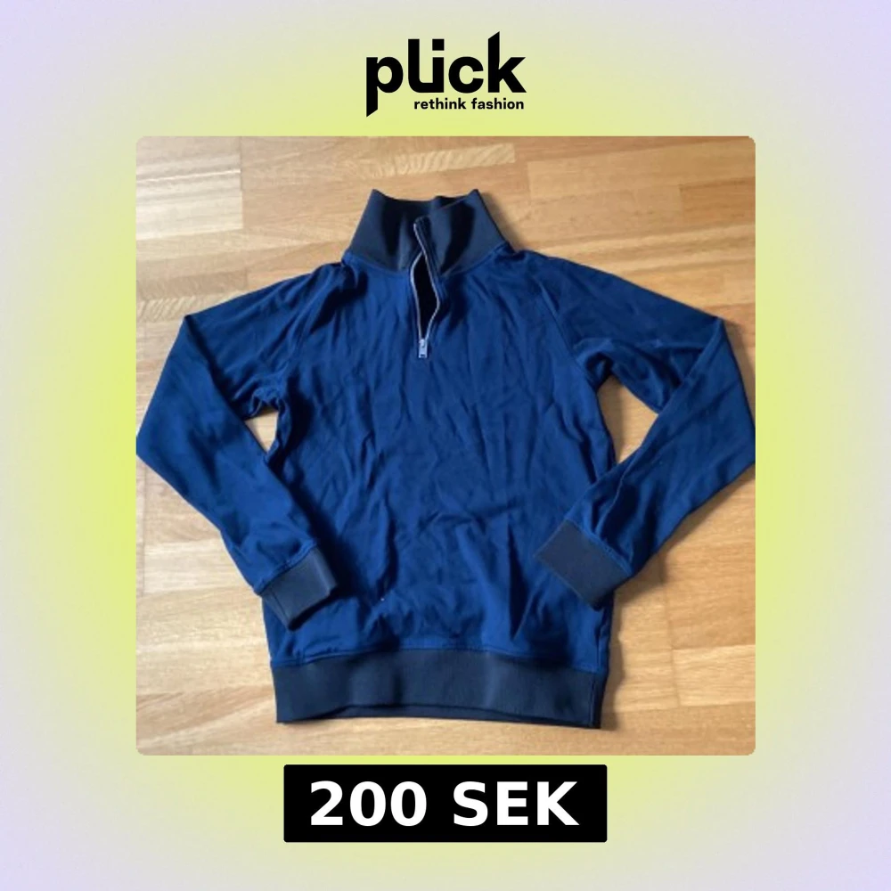 Snygg marinblå långärmad tröja från Selected Homme i storlek M. Tröjan har en hög krage med half zip-dragkedja och svarta ribbade muddar vid ärmslut och nederkant. Perfekt för chill dagar och enkel att matcha med jeans eller joggers.
