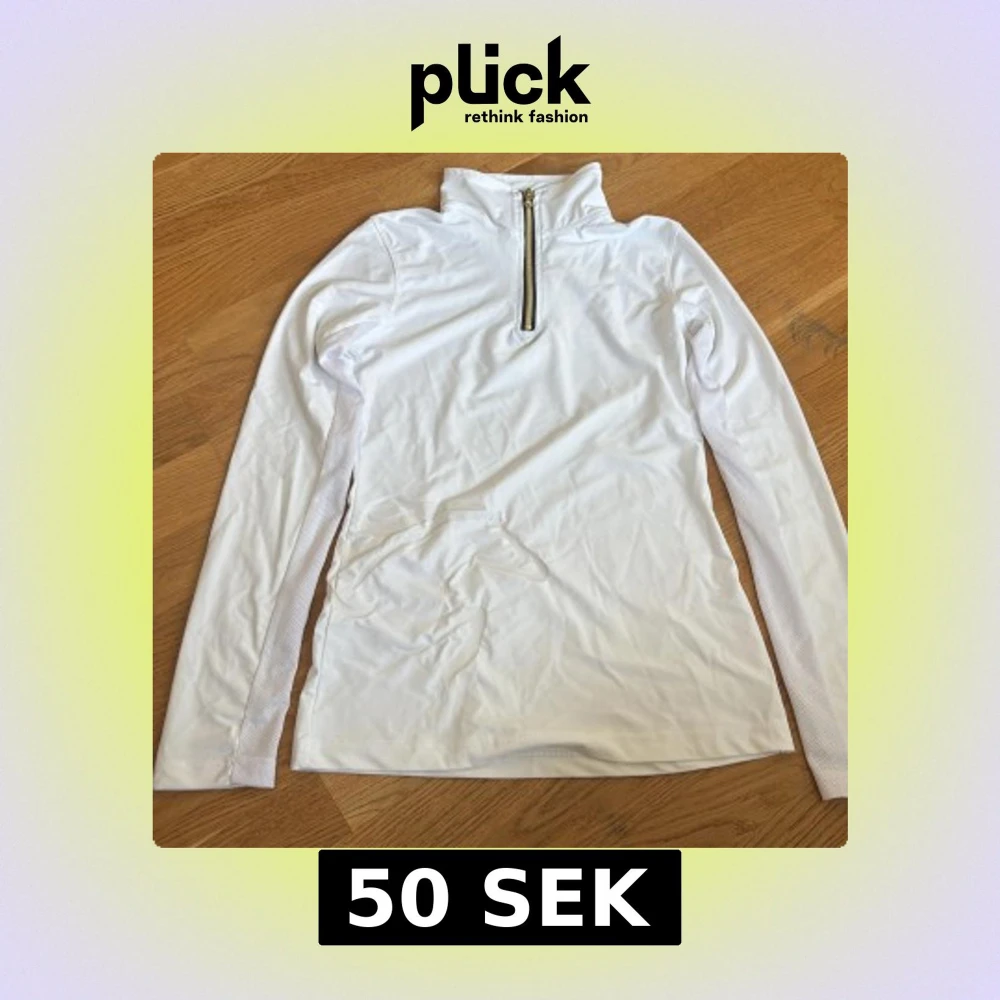 Vit långärmad tröja i syntetmaterial med guldig half zip-dragkedja framtill och hög krage. Snyggt präglat hästmotiv på framsidan och meshpaneler längs ärmarna för extra ventilation. Perfekt för dig som gillar ridning och sportig stil.